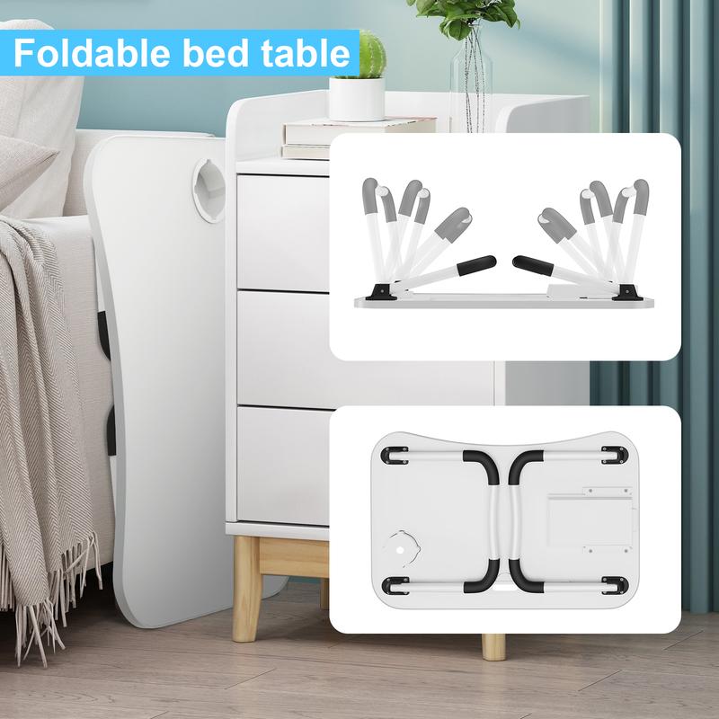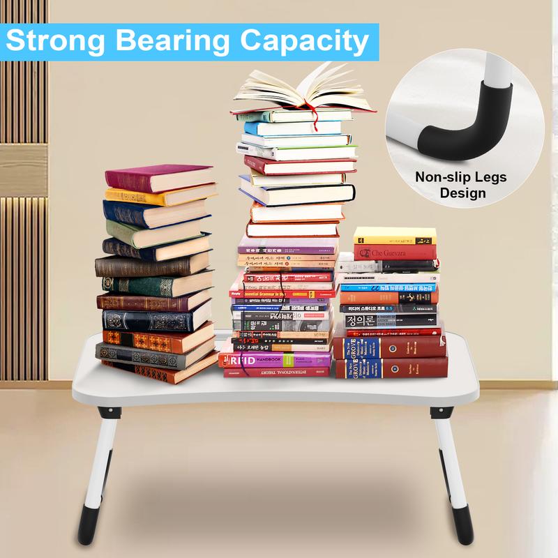 [Foldable Laptop Tray for Bed]Retractable legs could fold below this lap desk for easy storage and carry. No assembly required! Just simply pull out a foldabte leg and setup the table. And there is enough space for stretching your feet under the desk for bed. About the Max- Load, we have tested this bed laptop table and it has no problem bearing 88lb.