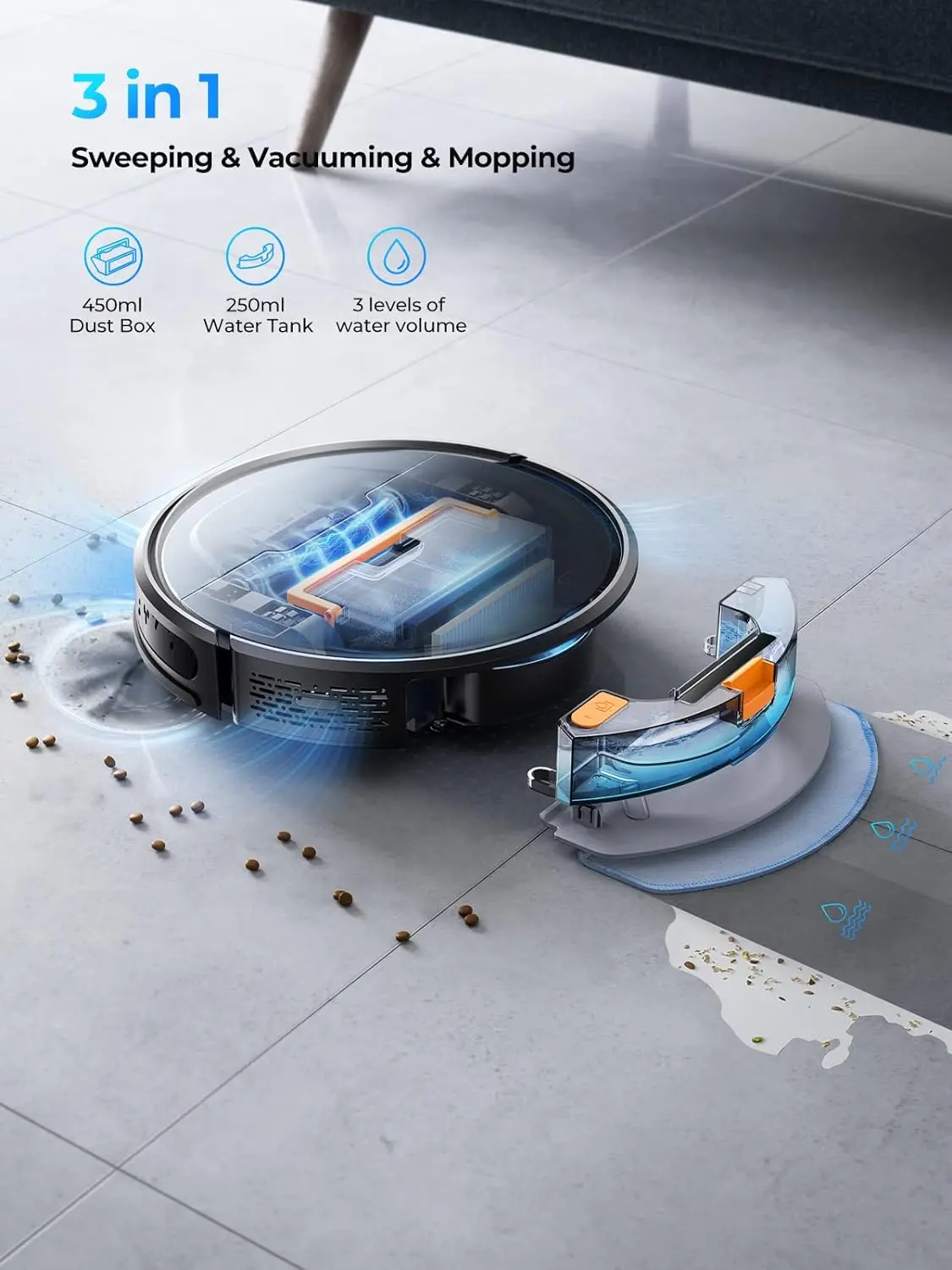 【All-in-1, Vacuum & Mop & Sweep】The robot vacuum cleaner integrates sweeping, suction, and mopping functions. The dust box and water tank can be installed simultaneously without the need for repeated replacement. You can choose to sweep only, mop, or both, greatly improving cleaning efficiency and handling all types of dirt, whether it's dust, debris, or liquid.