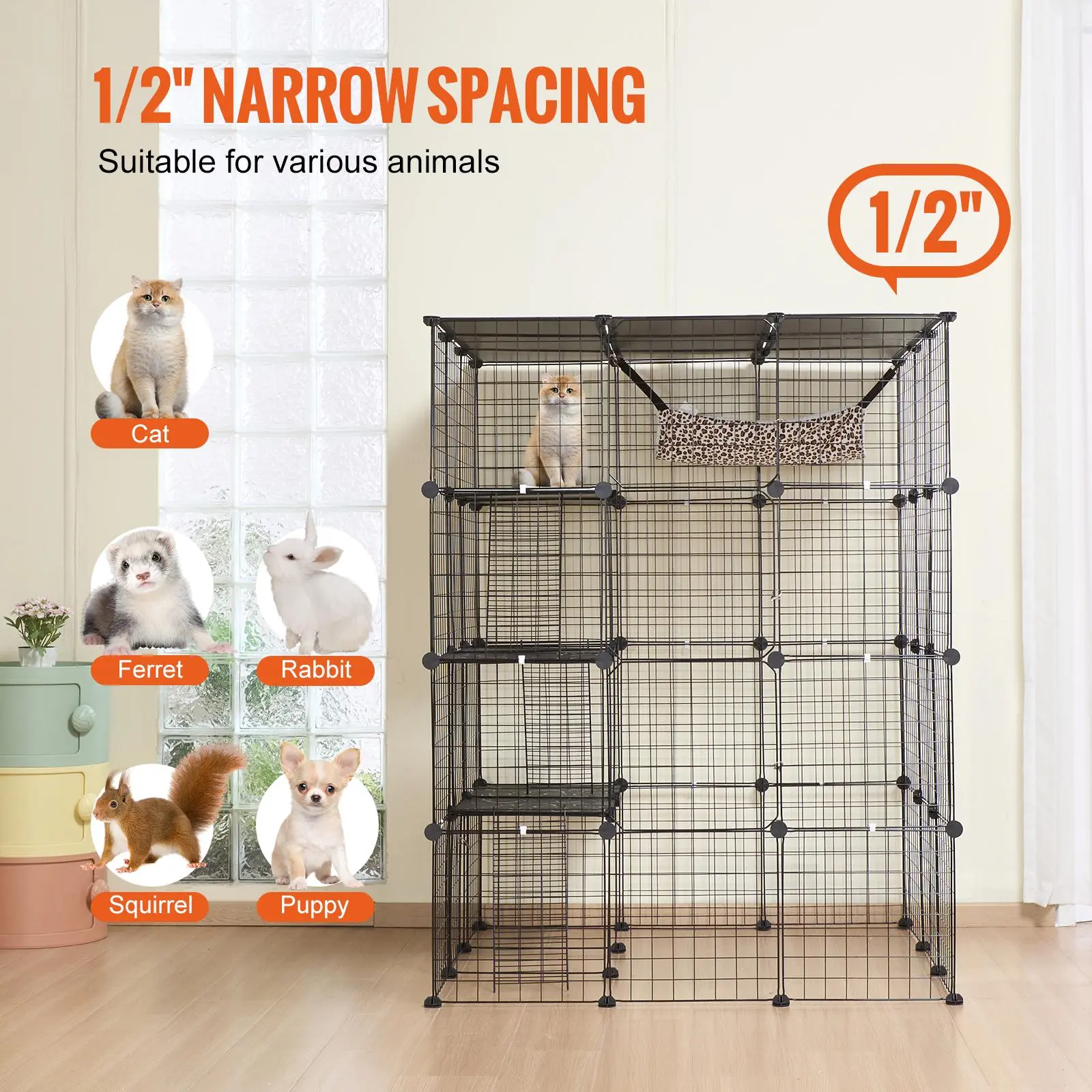 • Sturdy & Secure: Made of premium metal wire covered with anti-rust spray powder coating, the frame is very sturdy, and hard to break or distort readily. Thickened PVC plastic board can provide a stable support for cats to keep them from falling. Reinforced door latch buckle and zip tie to ensure the stability of the cat house. The 1/2'' interval between each wire is small enough for the cat to climb or jump without injury.
