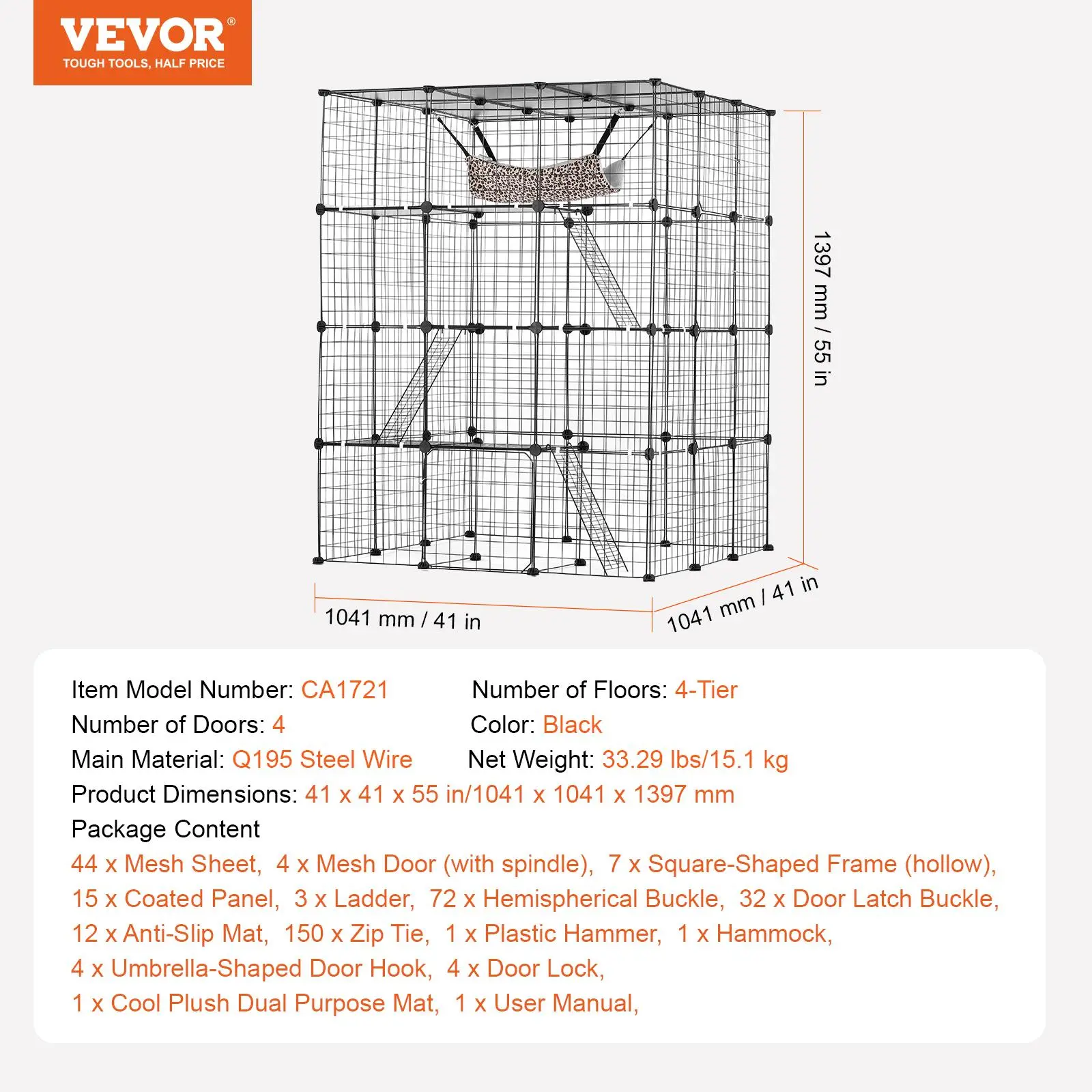 5. VEVOR Large 4-tier Cat Cage, 41 x 41 x 55", Detachable Metal Wire Cat Enclosure, with 4 Front Doors Hammock Ramp ladders, Indoor & Outdoor Crate Exercise Place Ideal for Kitty, Small Animals, Black