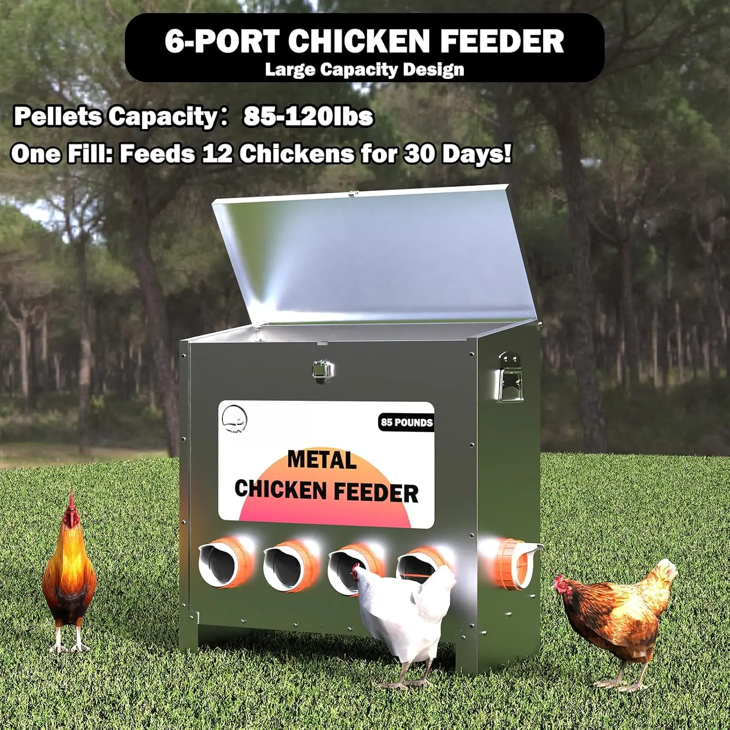 Large Capacity: Fewer fills for easy maintenance! The feeder holds 85lb of pellets, can provide 10 adult hens with 30 days of intakecrumbles, or scratch grains. Mount this feeder inside a coop or place it outside standing on its own.