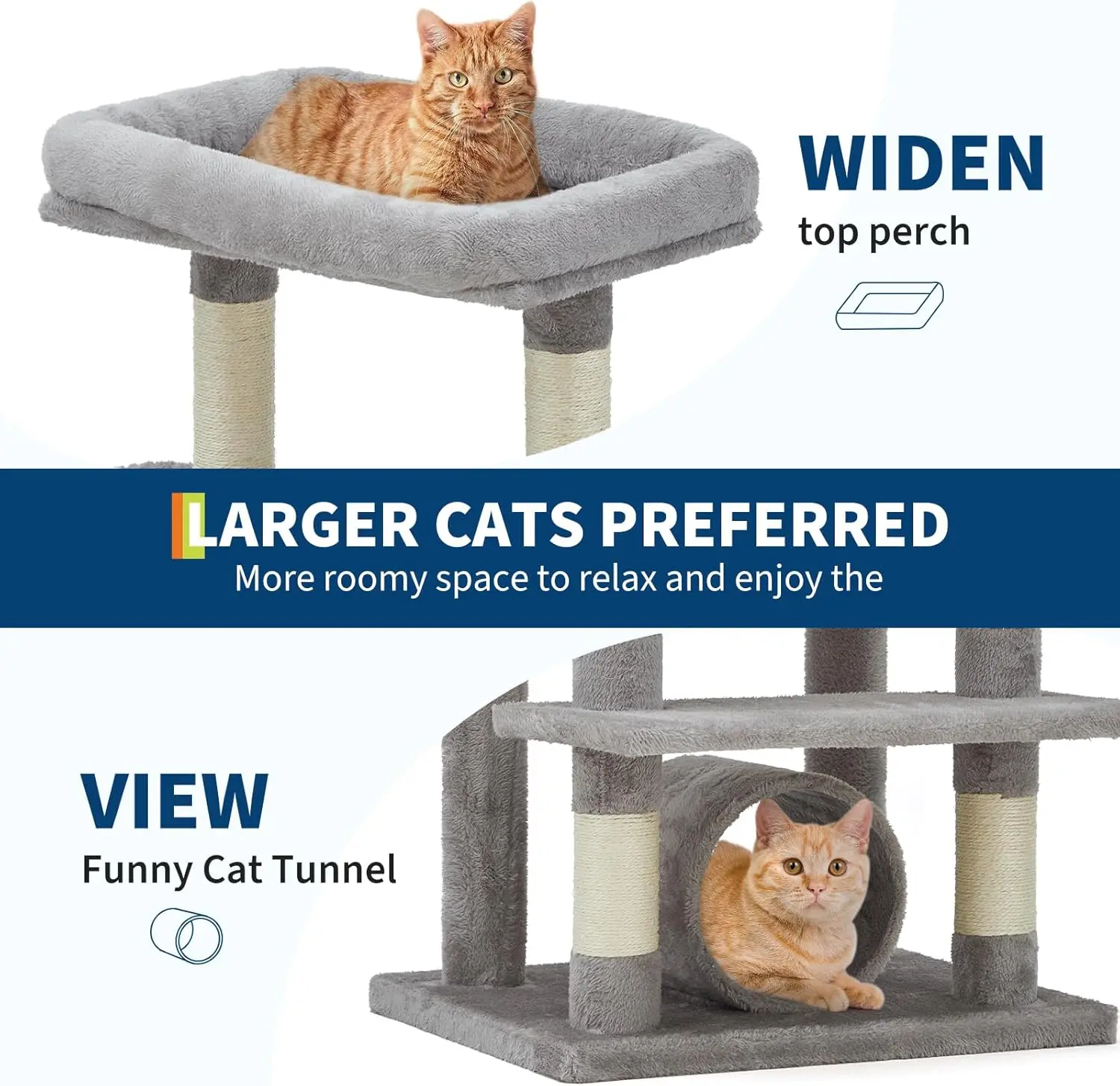 ·Spacious Design for Large Cats:Specifically engineered for bigger breeds, our cat tree boasts extra-wide platforms (15" diameter), an oversized condo (18"x18"), and deep plush baskets that comfortably accommodate large cats. The heavy-duty base supports multiple cats simultaneously, making it ideal for multi-cat households. High-density compressed wood and thick sisal posts provide durability that stands up to even the most energetic cats.