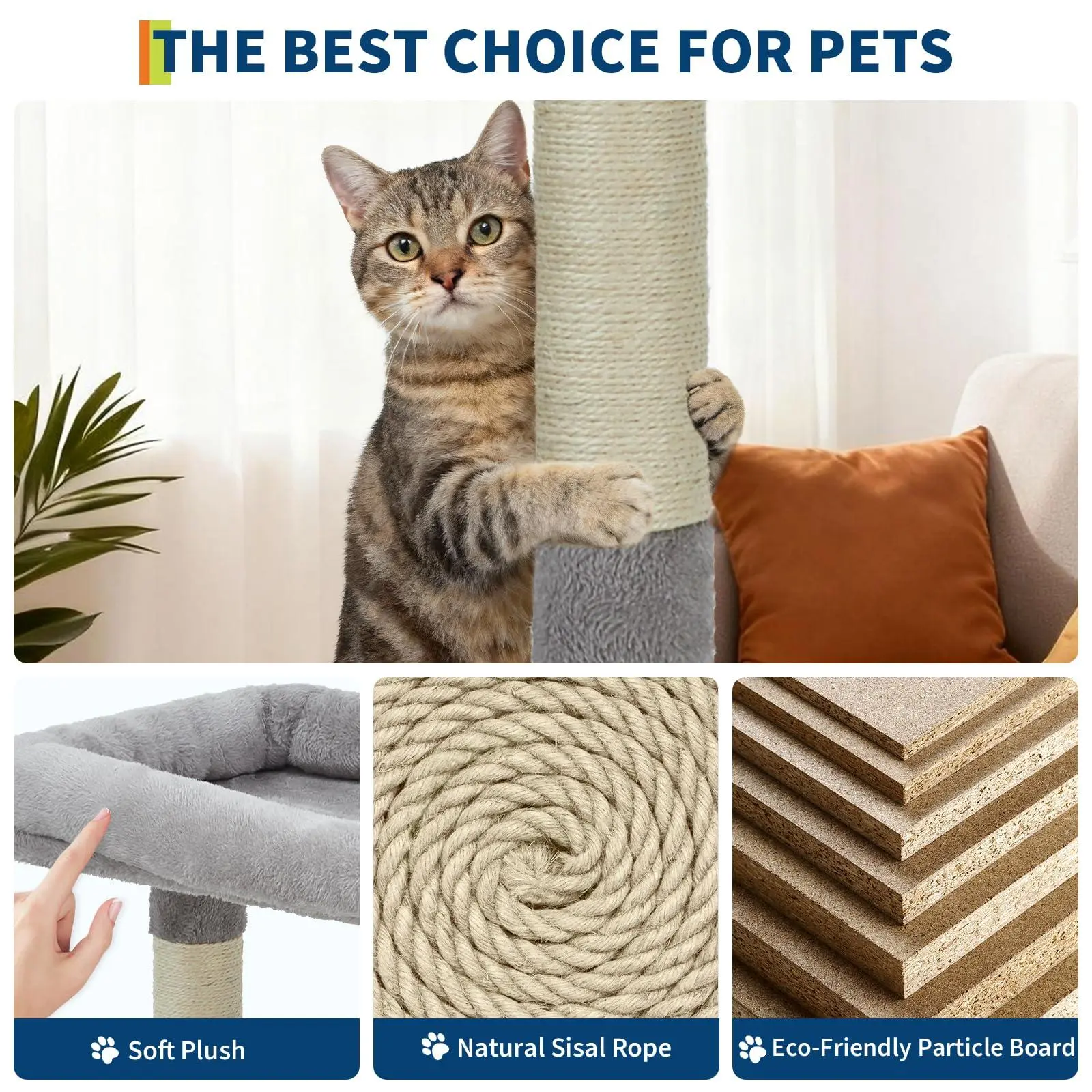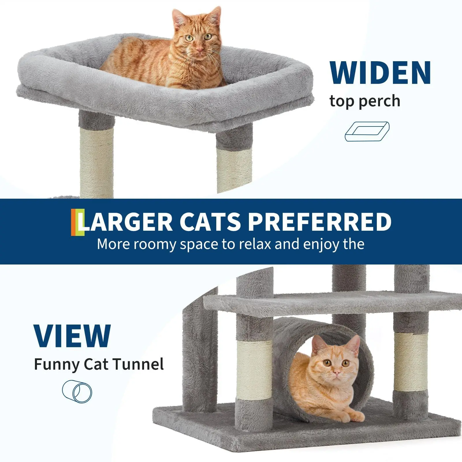 Spacious Design for Large Cats:Specifically engineered for bigger breeds, our cat tree boasts extra-wide platforms (15" diameter), an oversized condo (18"x18"), and deep plush baskets that comfortably accommodate large cats. The heavy-duty base supports multiple cats simultaneously, making it ideal for multi-cat households. High-density compressed wood and thick sisal posts provide durability that stands up to even the most energetic cats.