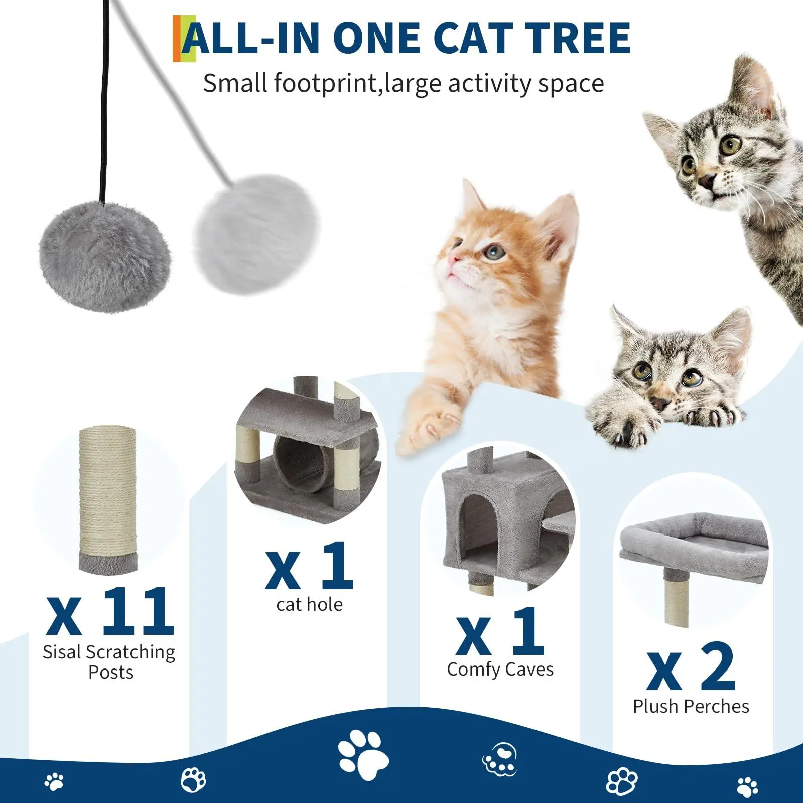 All-in-One Feline Fun Center:More than just a cat tree, this is a complete activity hub featuring a cozy hammock for napping, dangling plush toys for batting practice, dual removable food/water bowls for convenient dining, and an exciting catwalk bridge for adventurous explorations. The variety of textures - from soft plush to natural sisal - provides endless sensory stimulation to keep your cat engaged for hours.