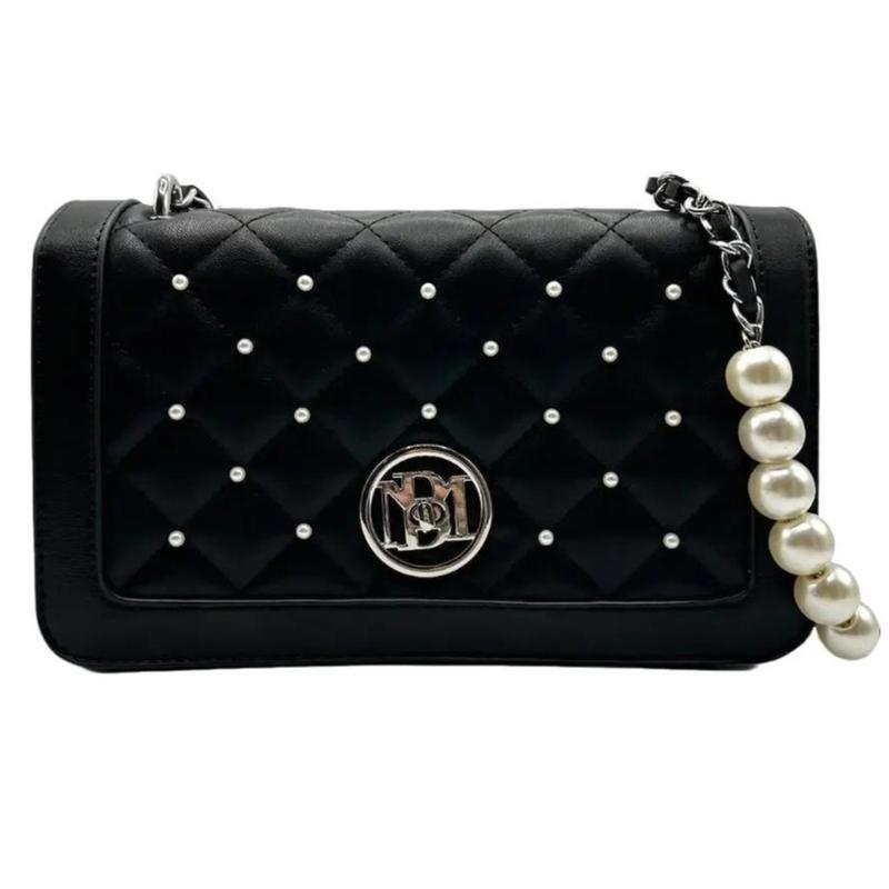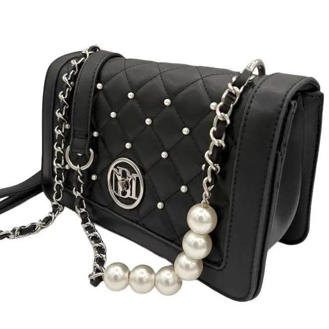 The crossbody is the perfect going out bag. Quilted, beautifully covered in pearls, and the Badgley Mischka Logo in gun metal hardware right in the middle.