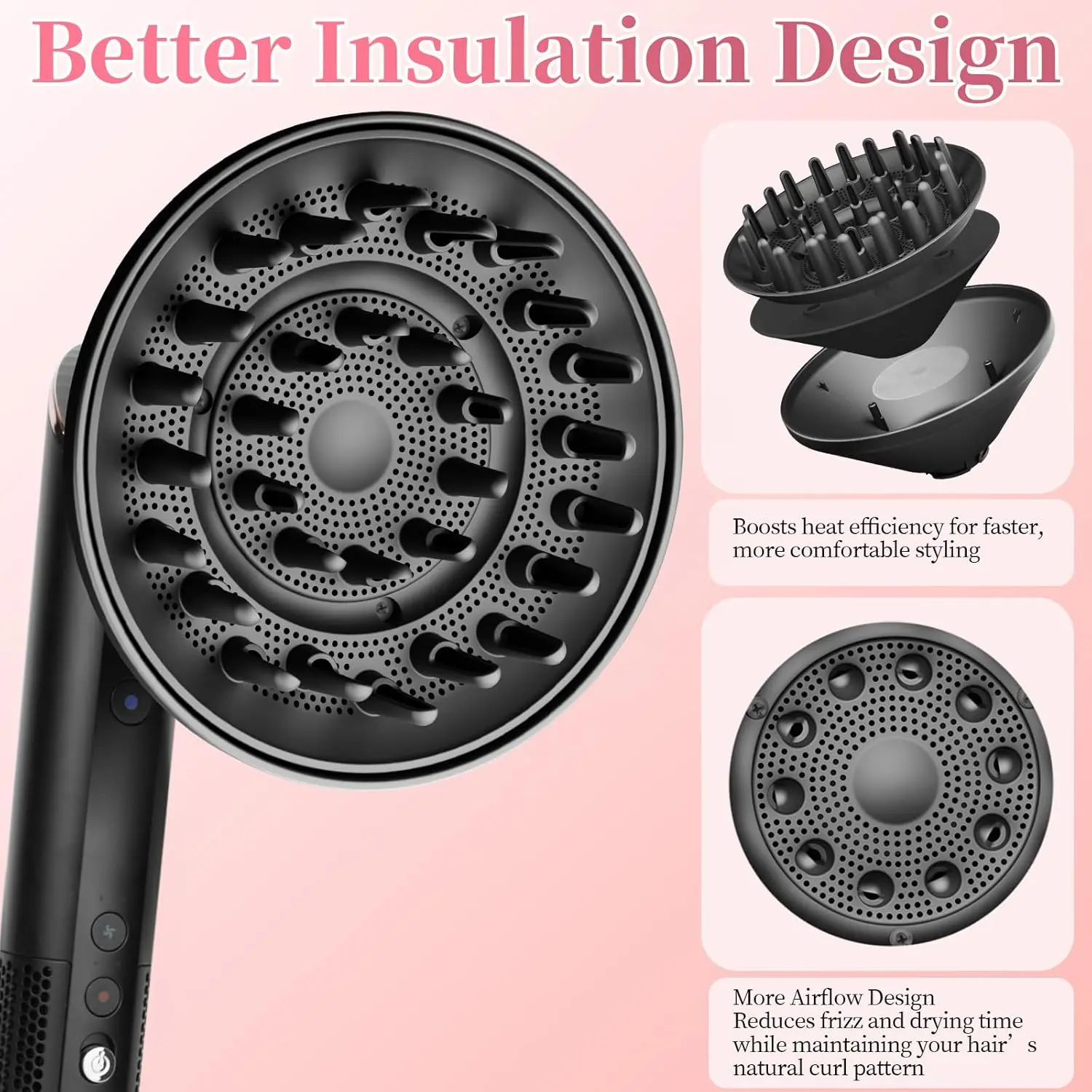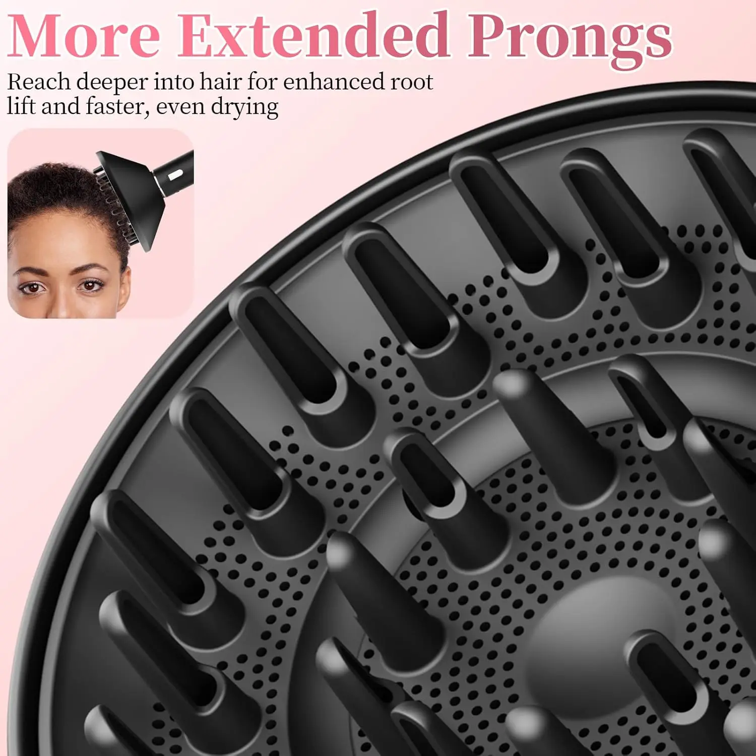 Gentle Drying from Root to Tip: Diffuses air evenly through your hair to help maintain softness and shine, ideal for preserving curl definition without overexposing strands to intense airflow