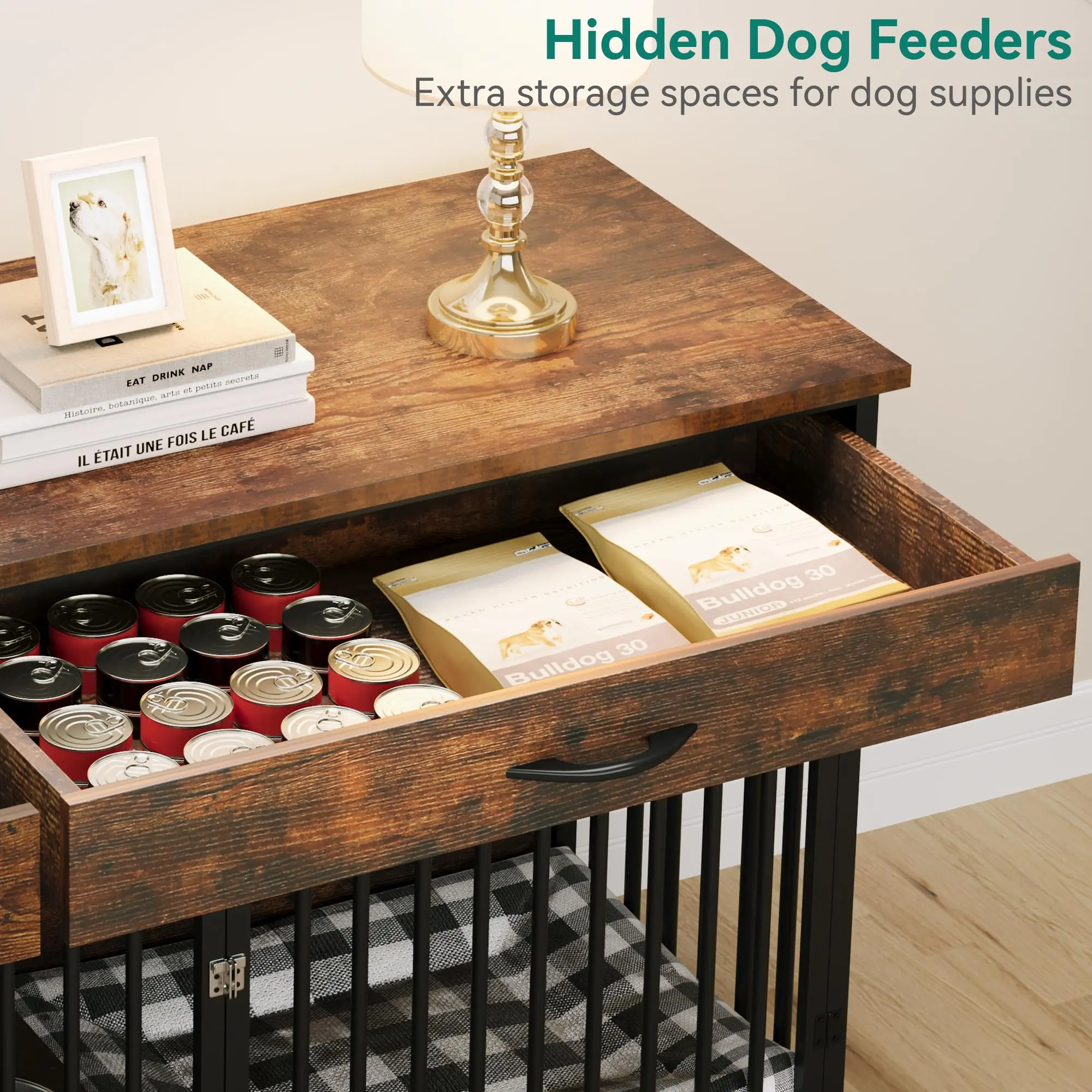 Double-tier Dog Kennel Furniture: Our large dog crate has a divider in the middle that can accommodate 2 medium/large dogs; The crate door is fitted with sturdy metal bolts to prevent your beloved dogs from running around
