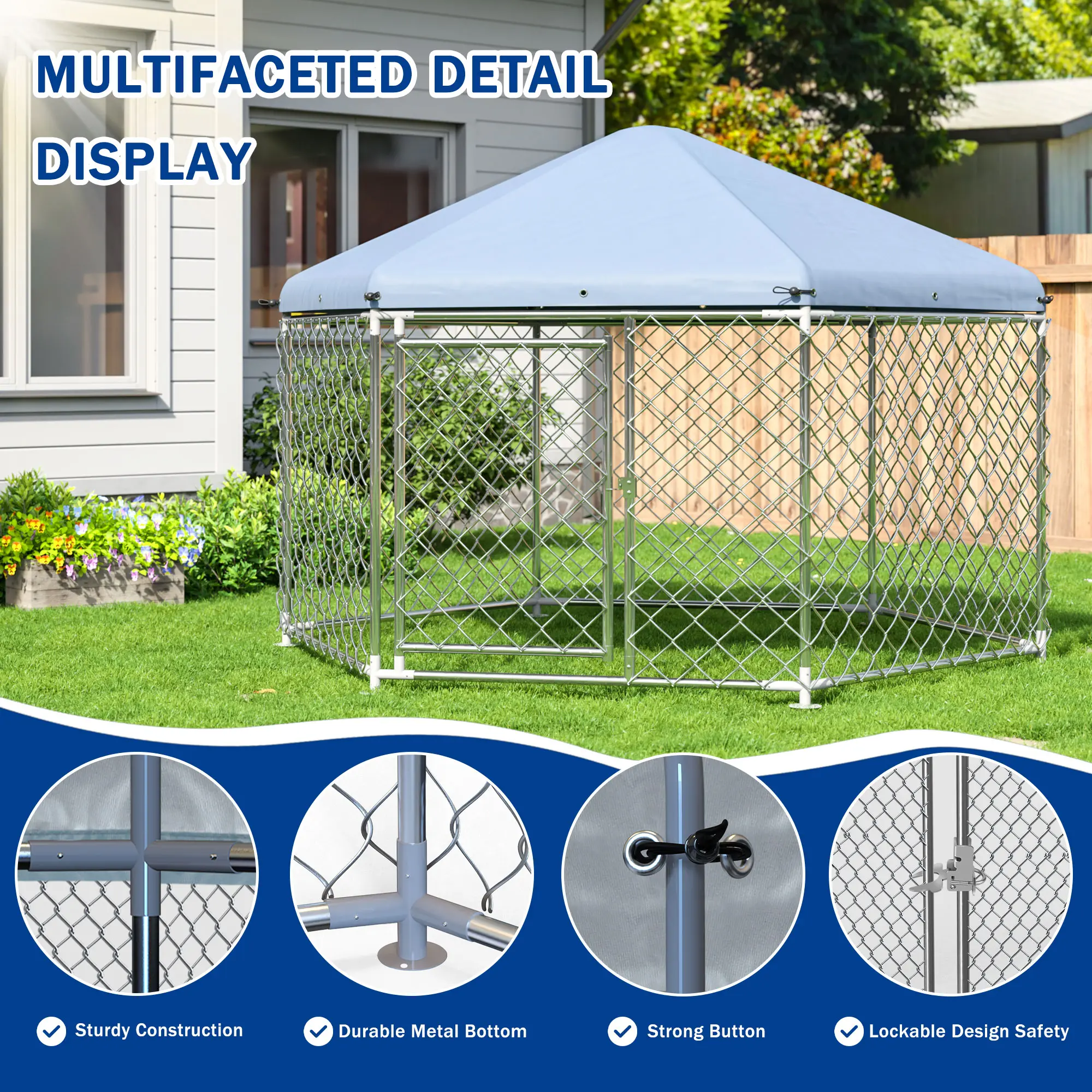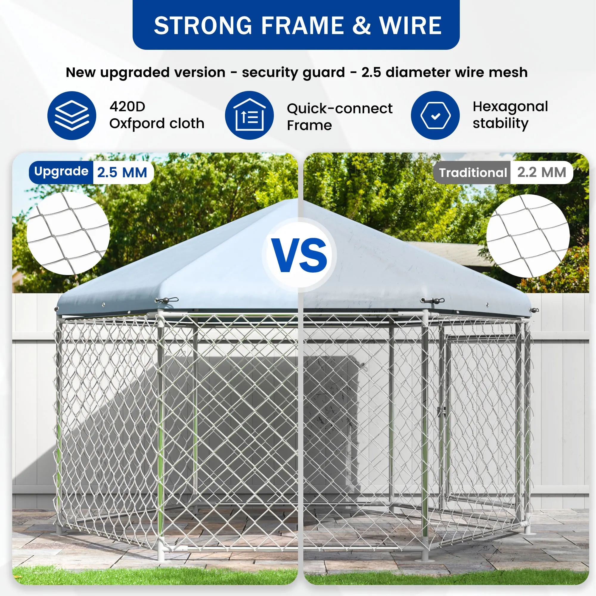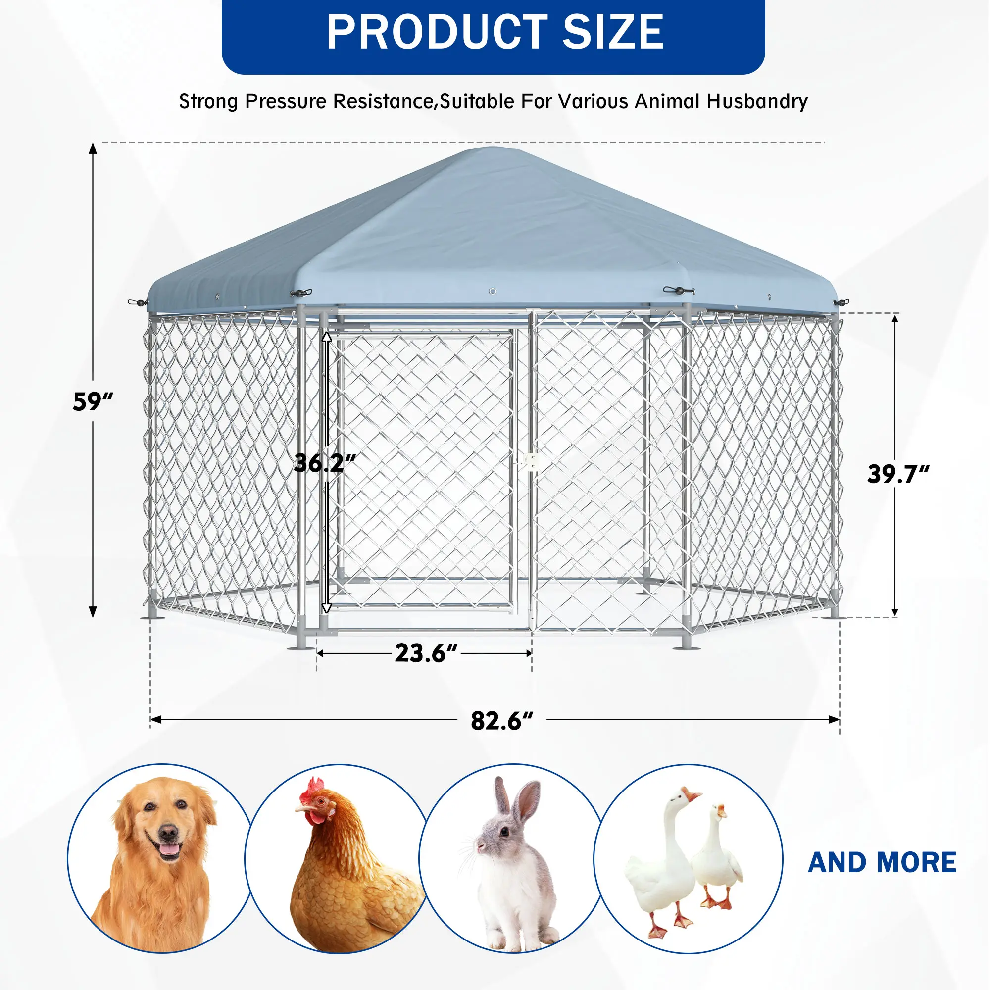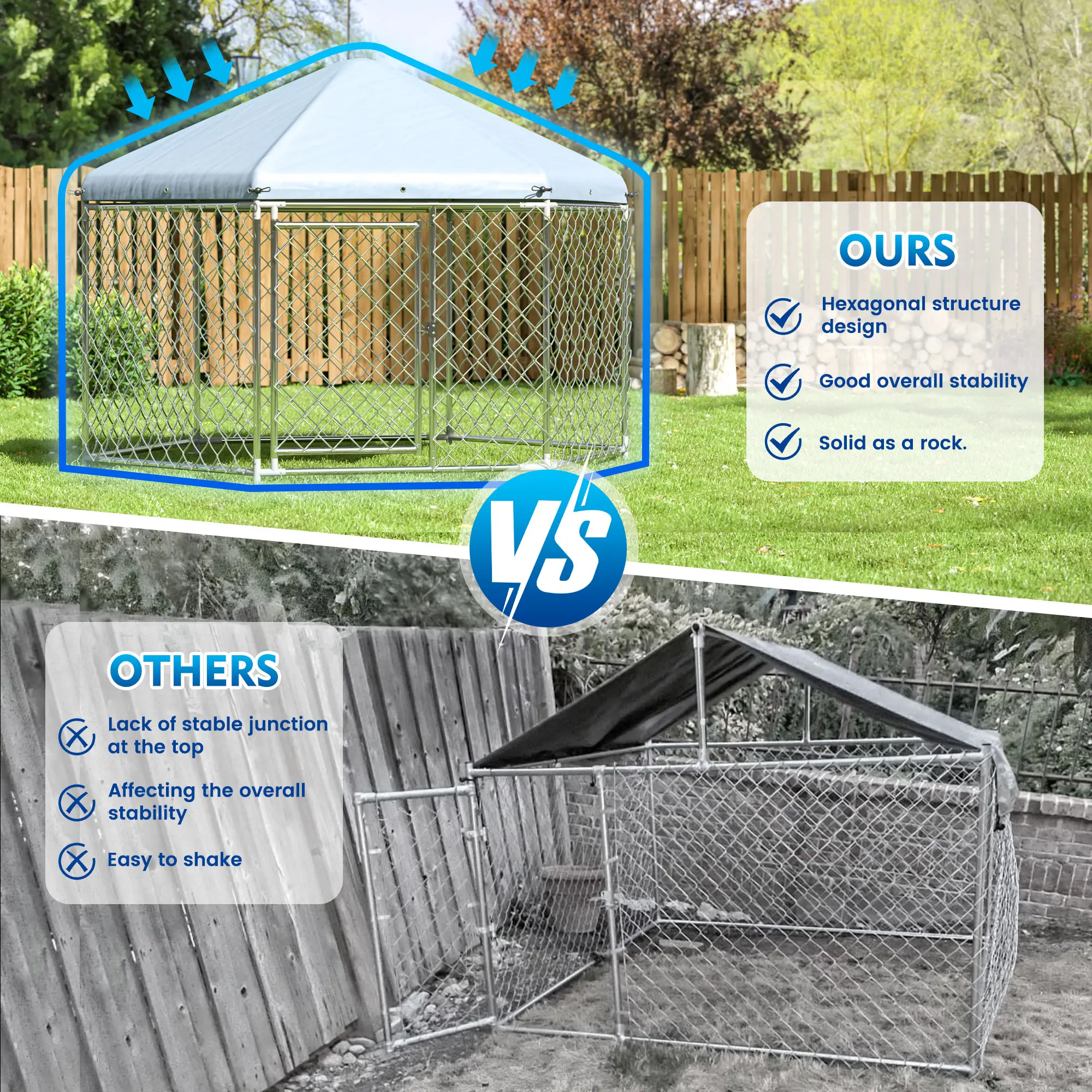 ·【Spacious Haven for Canine Enjoyment】With dimensions measuring 6.9x6.9x4.9FT, this spacious dog kennel offers ample room for your furry companion to frolic, play, and stretch their legs. Customize the area with a cozy dog house and feeding station, creating a welcoming environment for your cherished pet. Bid farewell to worries about your dog feeling isolated or confined.