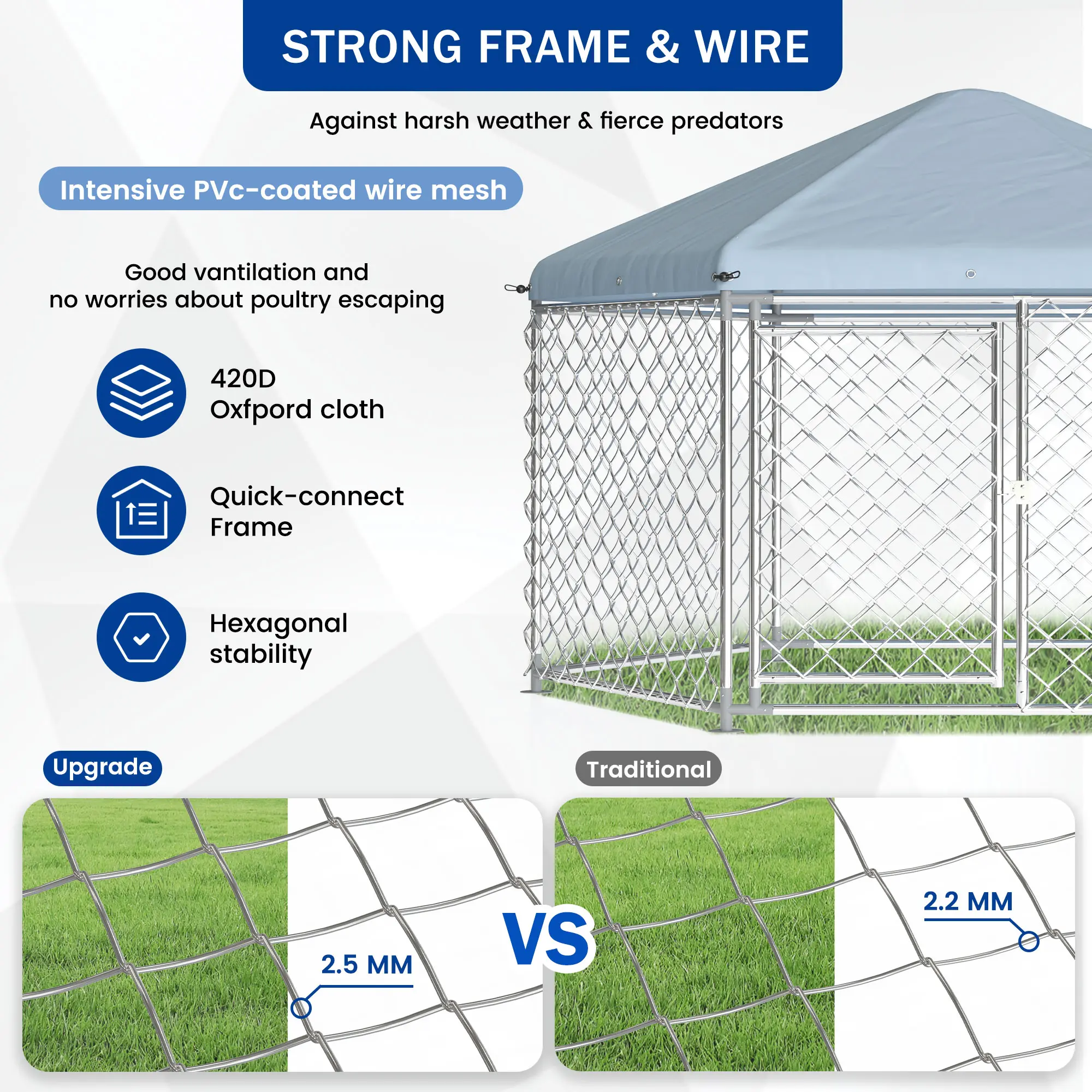 ·【Weatherproof Canopy & Reliable Door】Featuring a weather-resistant, UV-protected canopy, this dog enclosure shields your pets from harsh weather elements. For added security, use iron wire and plastic ties to reinforce the lower edge of the wire mesh, preventing pets from damaging it or escaping.
