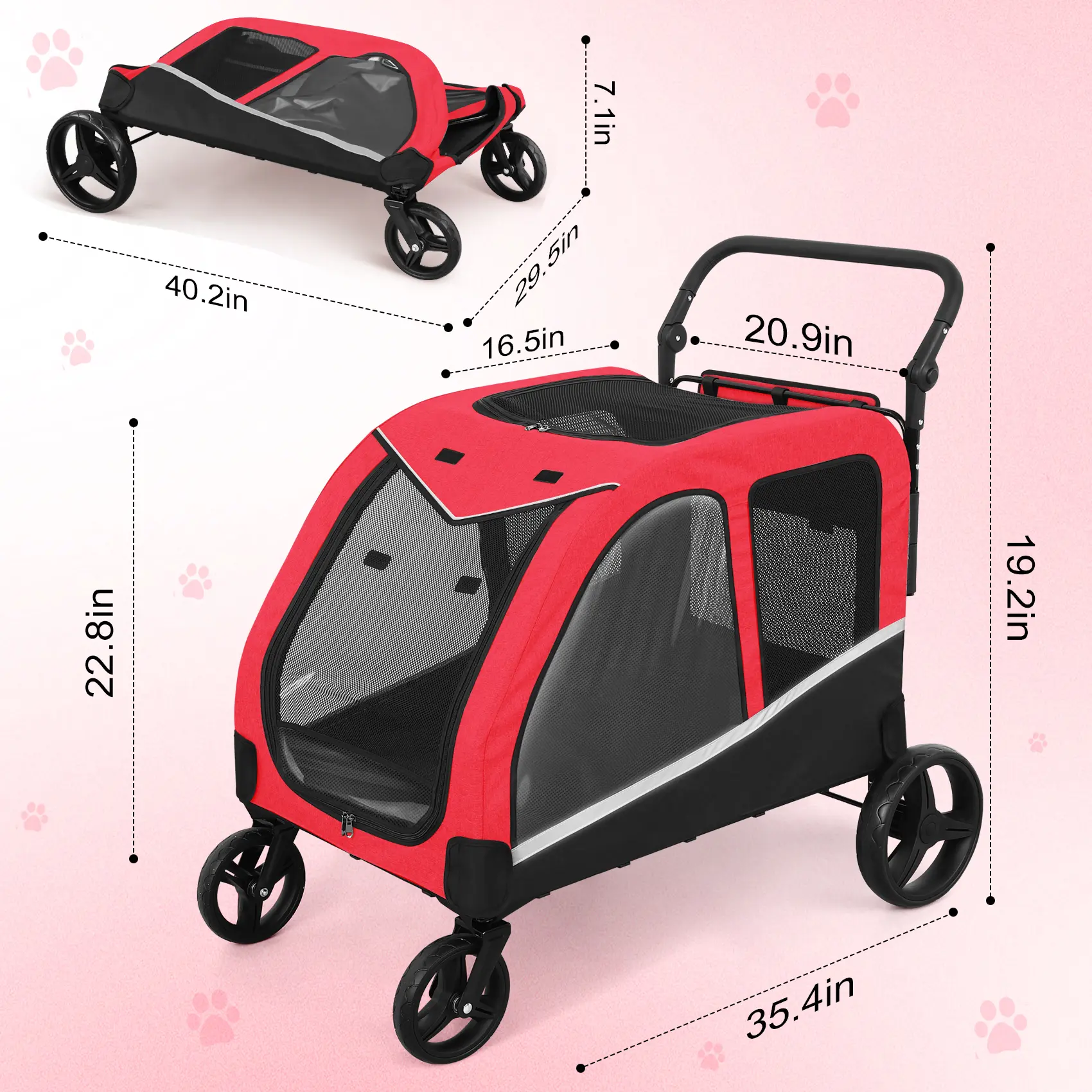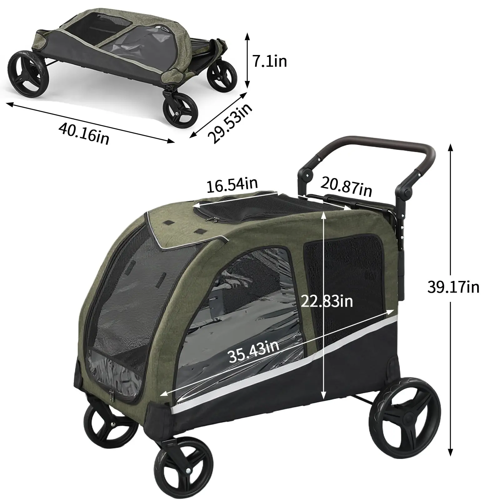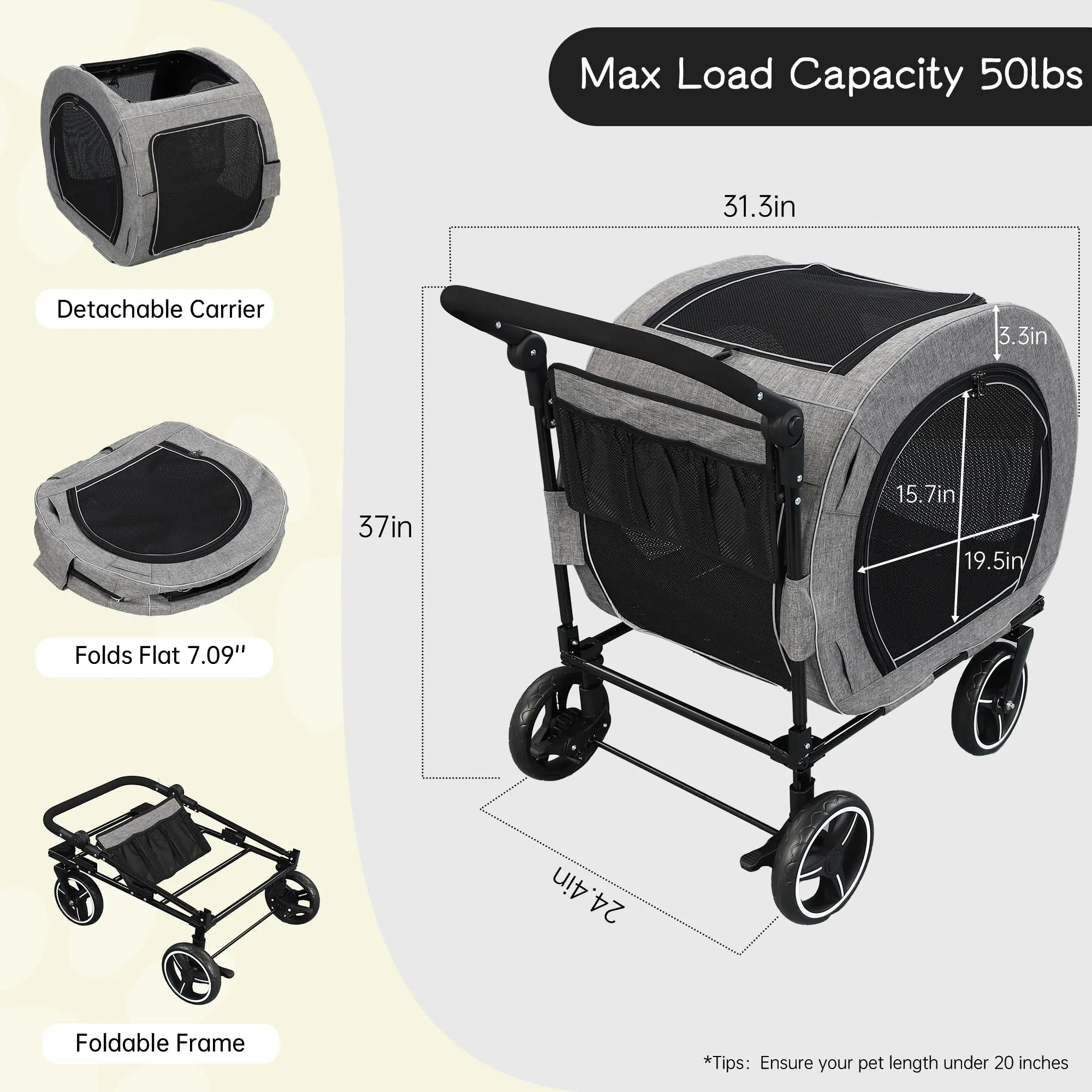 Internal dimensions: 35.4"L×23.6"W×20"H, maximum weight capacity up to 160 lbs. The dog carriage’s handle is adjustable, allowing users to adjust the handle according to their height for comfortable holding.