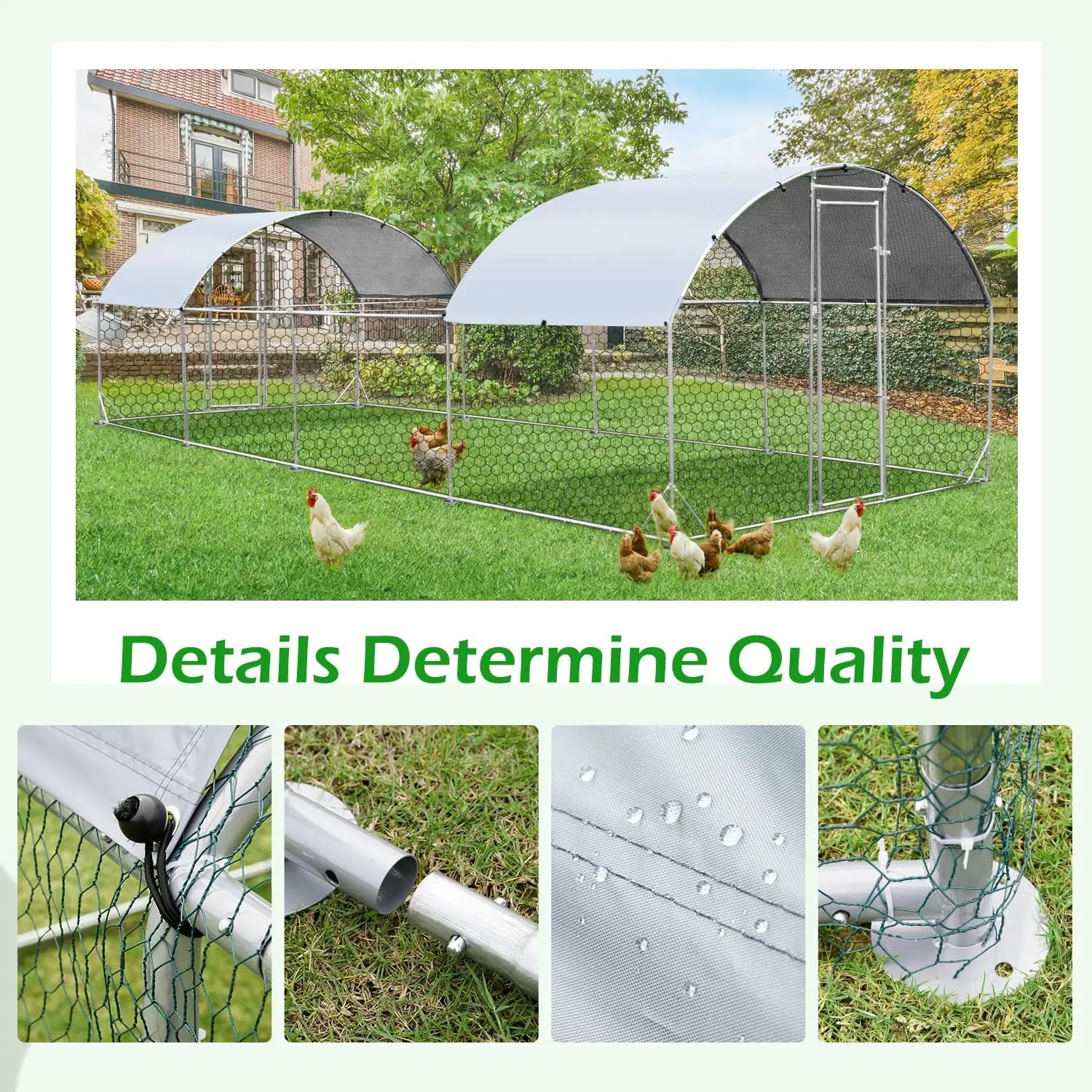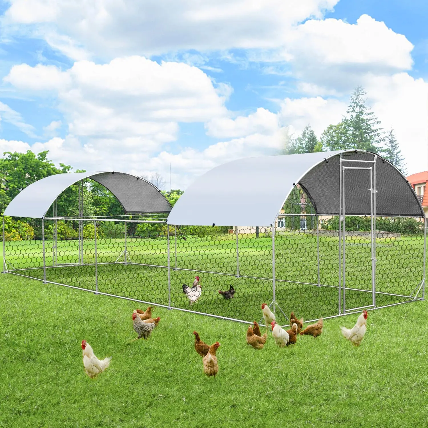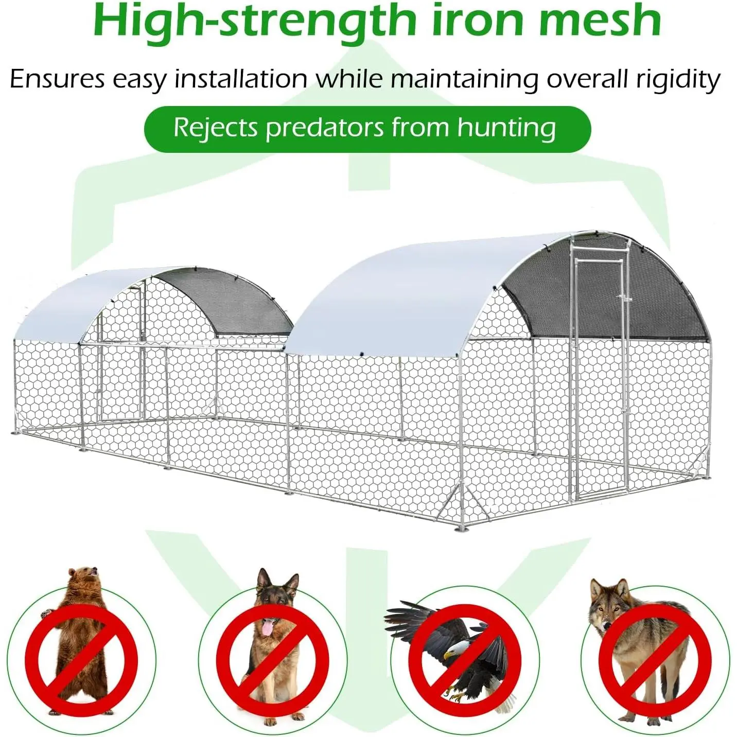·Sturdy Endurance: The entire stainless steel framework, coupled with the fortified wire mesh, contributes to a substantial weight of 130 lbs for the chicken coop. Despite the iron chain link fence's myriad of openings, it can withstand winds up to 40 mph. Additionally, an extra 98 Sq.Ft of canopy ensures your pets can relish the outdoors in diverse weather conditions.