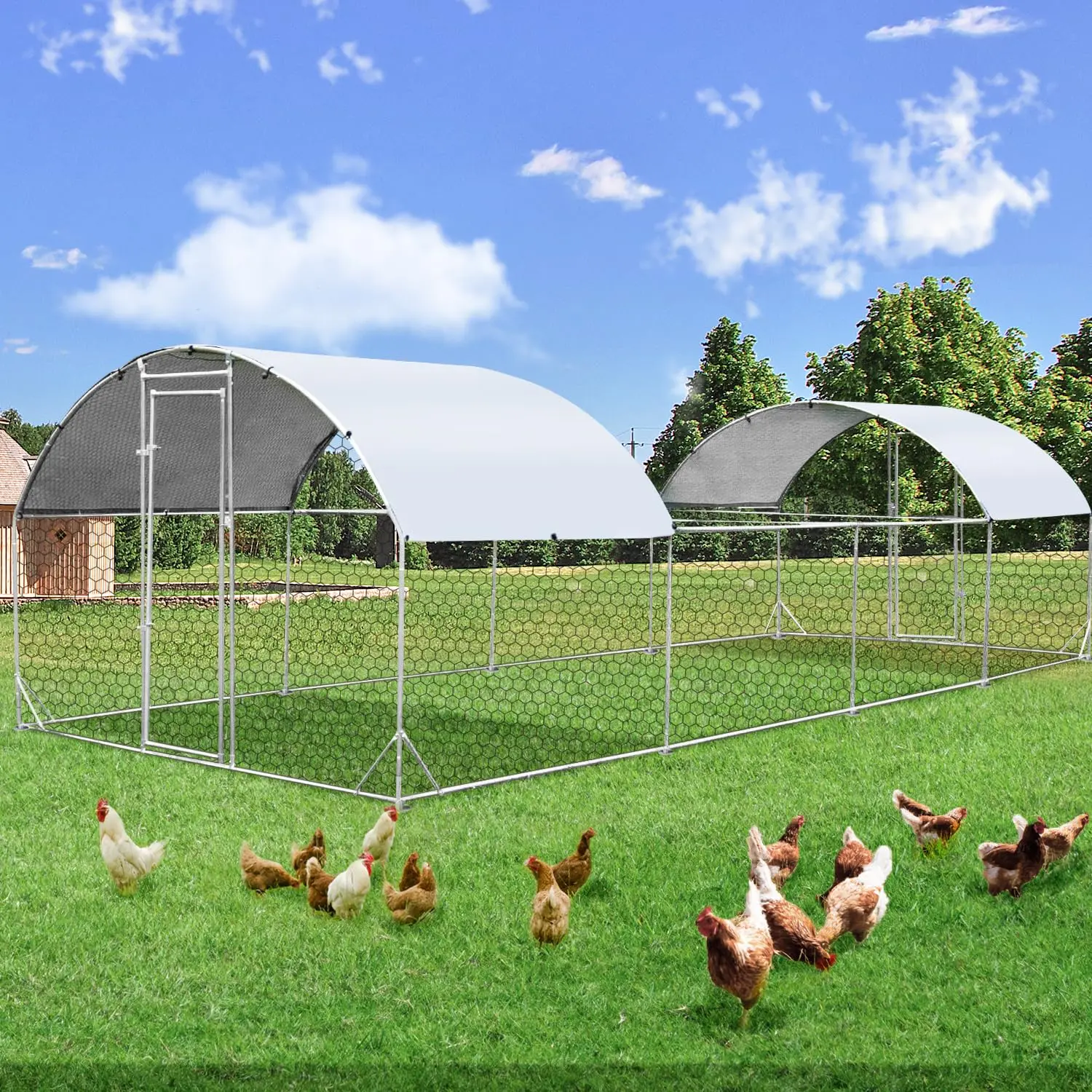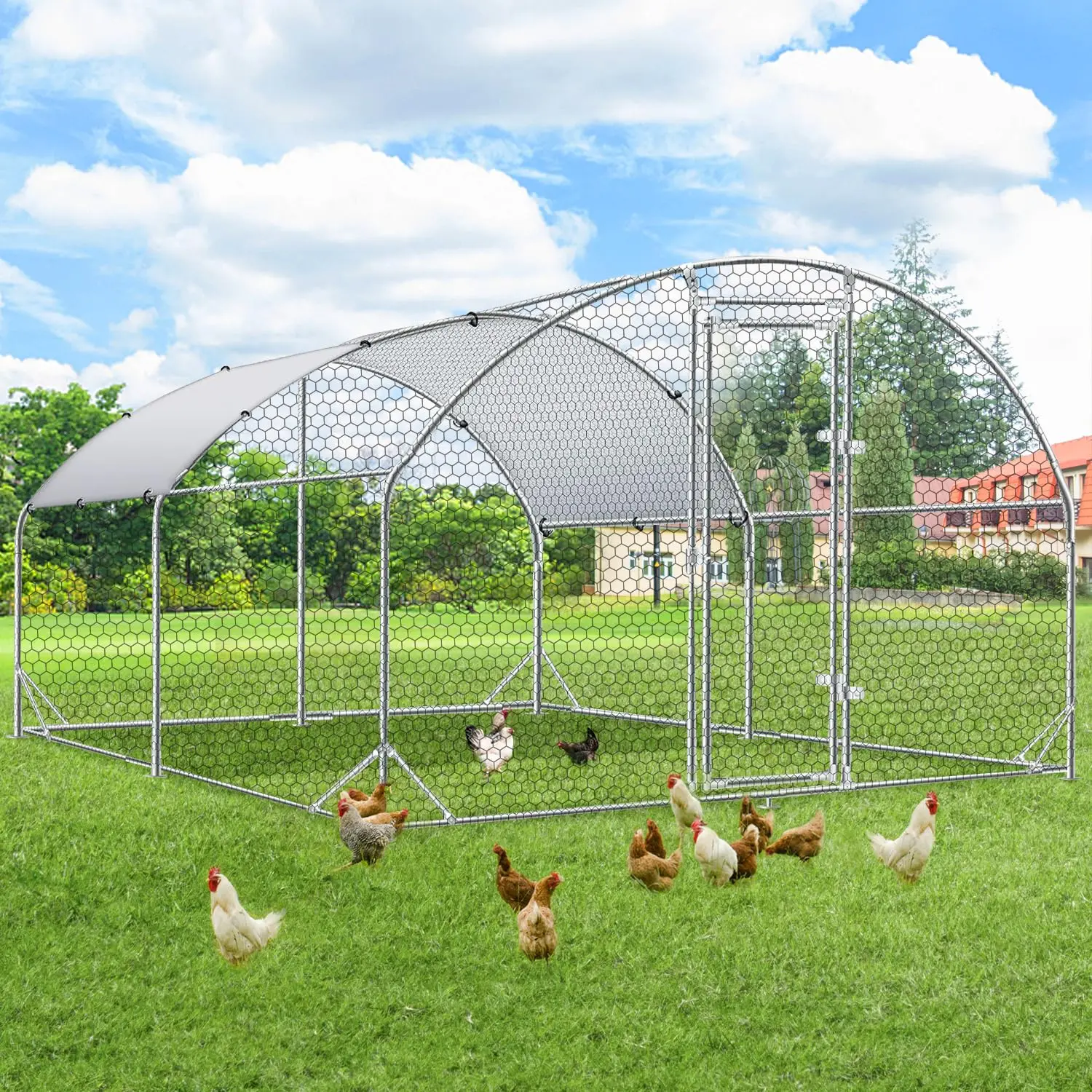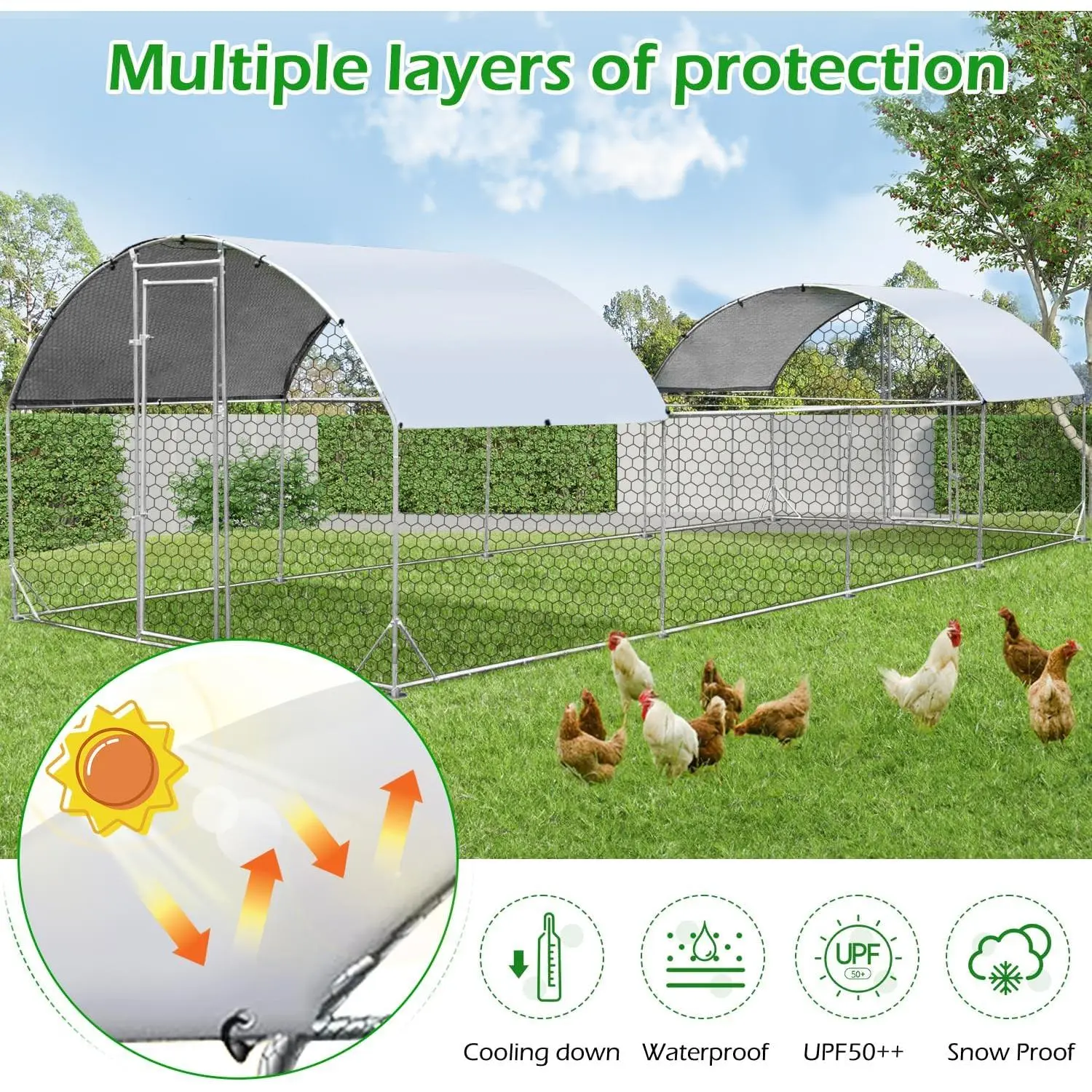 ·Sturdy Endurance: The entire stainless steel framework, coupled with the fortified wire mesh, contributes to a substantial weight of 130 lbs for the chicken coop. Despite the iron chain link fence's myriad of openings, it can withstand winds up to 40 mph. Additionally, an extra 98 Sq.Ft of canopy ensures your pets can relish the outdoors in diverse weather conditions.
