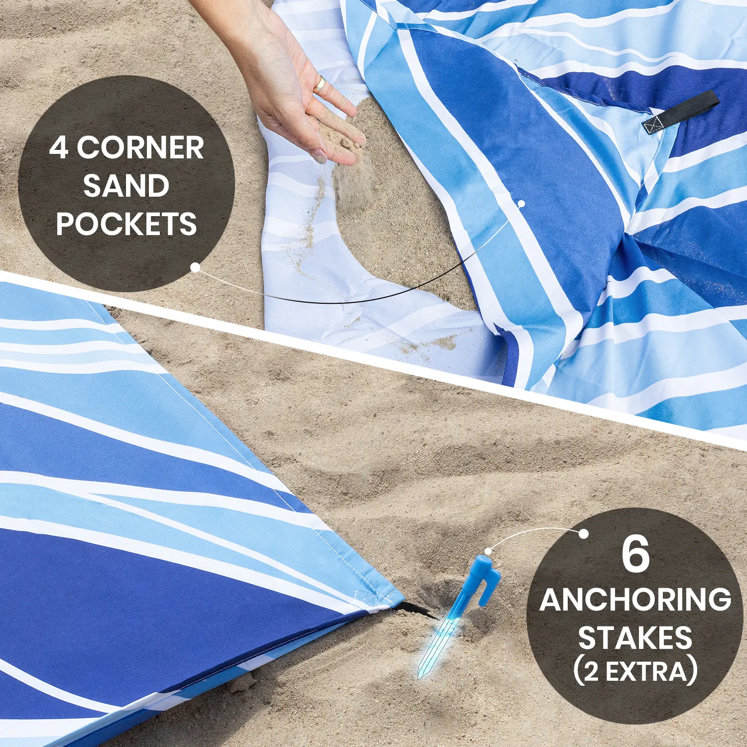 ·WIND RESISTANT DESIGN: With 4 sand anchoring pockets, 4 securing straps, and 6 ground stakes, our beach blanket waterproof sandproof remains secure and stable even on the windiest of days
