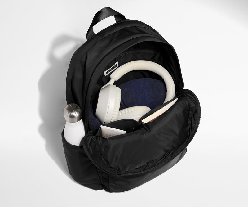 The Large Featherlight Backpack looks low profile, but it's filled with clever travel details. A zippered laptop sleeve keeps your tech secure and protected, with easy access in the security line. Inside the front pocket, you'll find a perfectly sized passport pocket, plus an extra zipper pocket to keep loose belongings organized. There's a place for not one but two water bottles—anything to stay hydrated—and adjustable, padded shoulder straps to keep your back happy, no matter how much you pack in. As with all of our backpacks, there’s also a trolley sleeve, so you can slip it onto any Away suitcase when you want to let it ride. It's a big lift for a light bag.