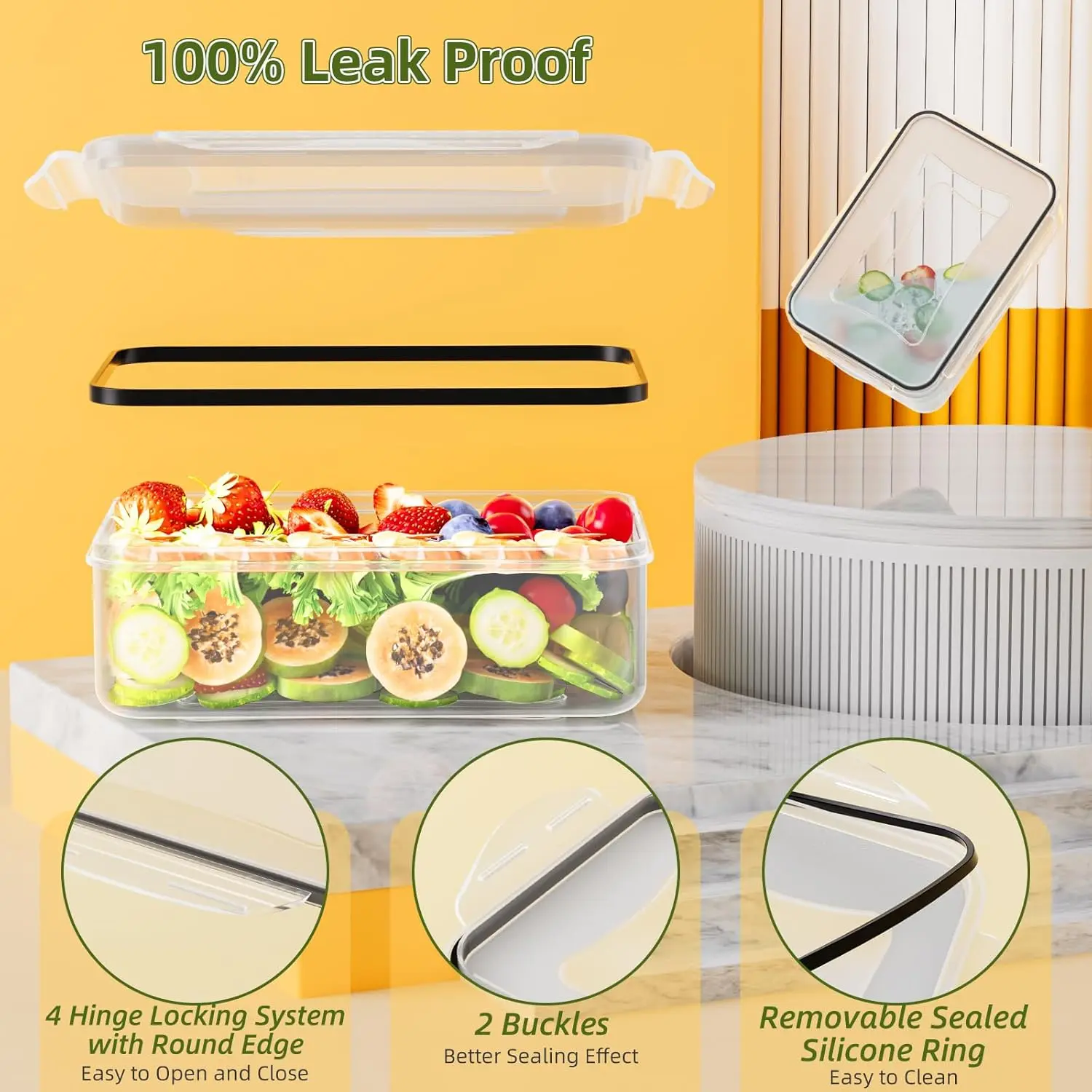 ·[AIRTIGHT & LEAKPROOF] This upgraded food storage container designed with removable silicone rings and 4 sturdy locking clips, easily be closed by adding little pressure than old version, ensuring that your food fresh and tidy by preventing food spillage and leakage of food smell.