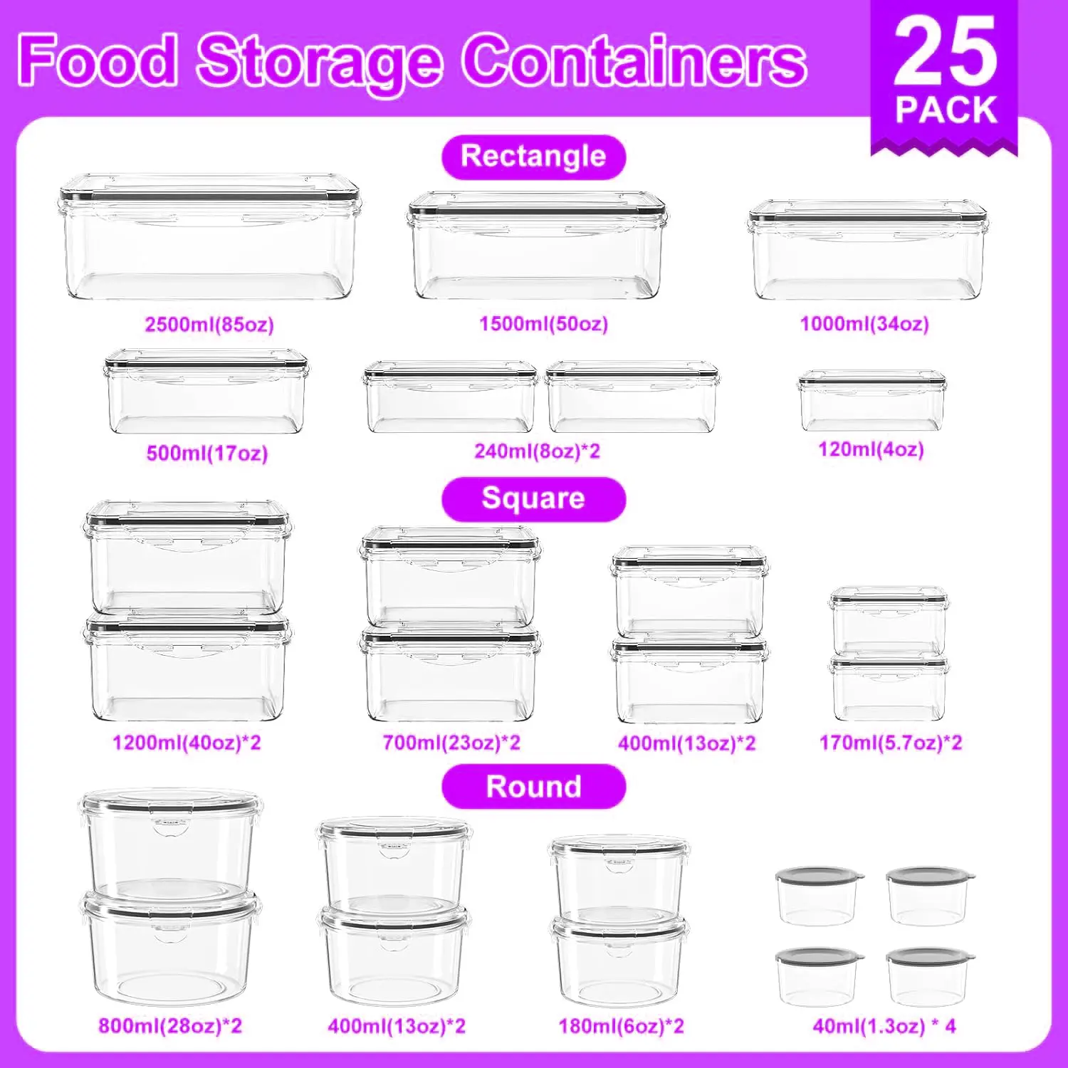 ·[VARIOUS SIZES] Our food storage containers consist of 20/25 containers and 20/25 Snap Lock lids. Different sizes and shapes to meet different food storage and keeping fresh needs.