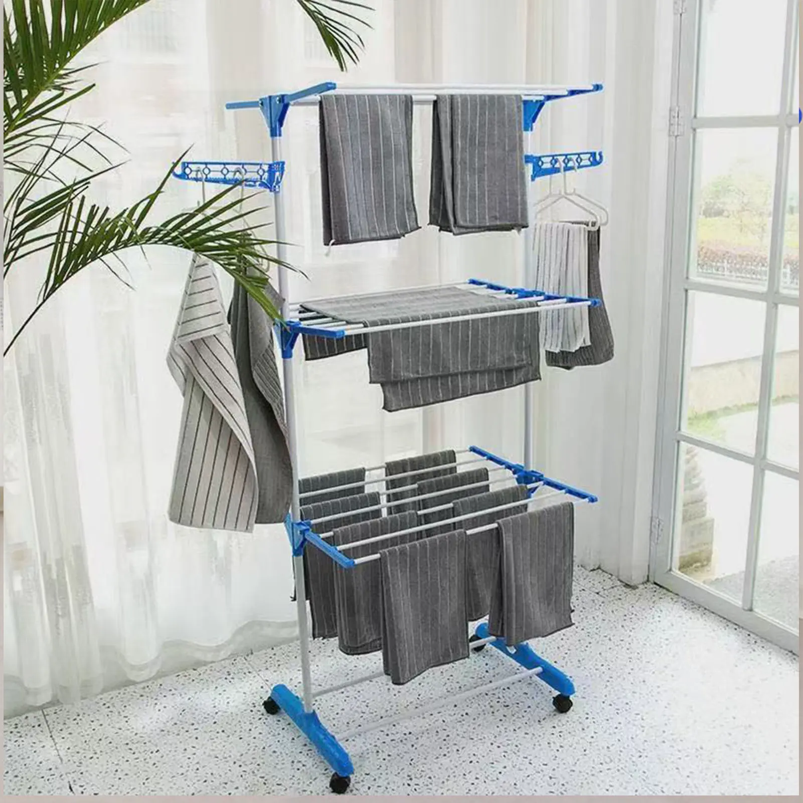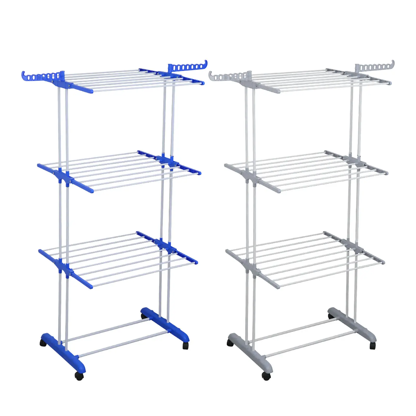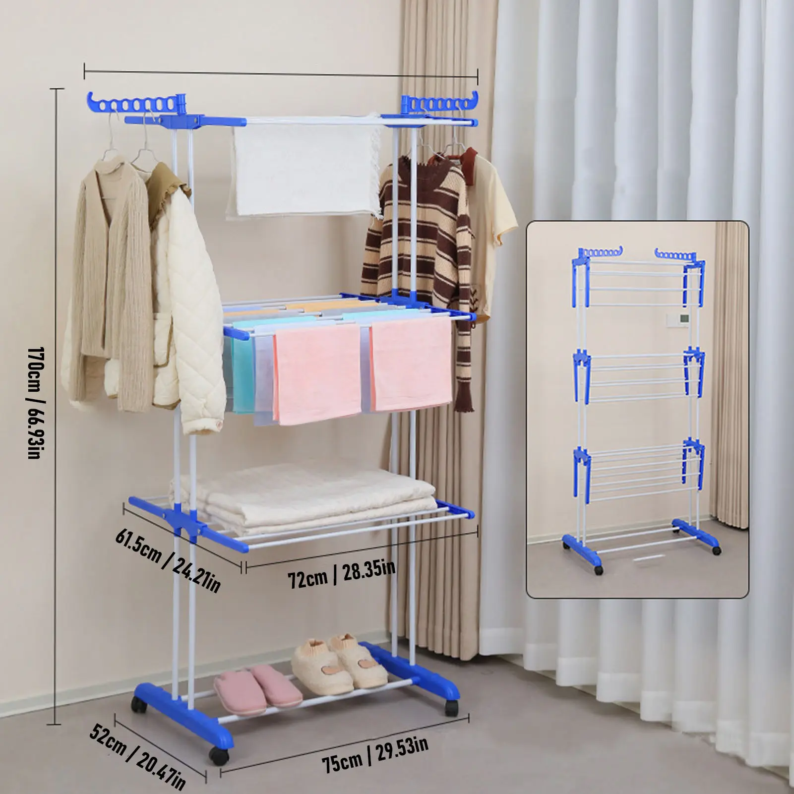 Clothes drying rack, large four-layer foldable drying rack, with four universal wheels for mobility. Multi-functional stainless steel drying rack, blue/gray