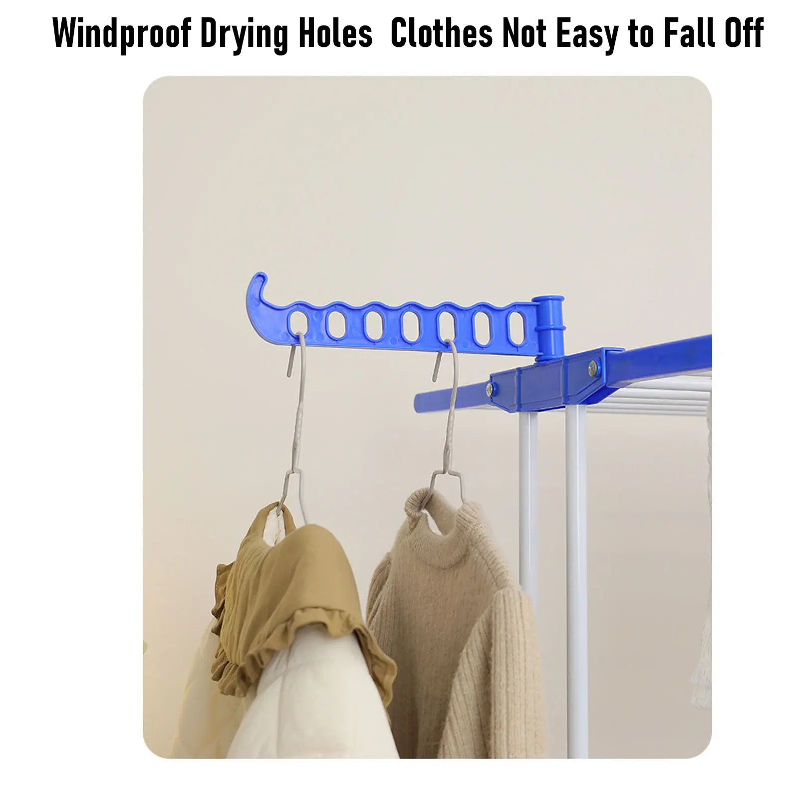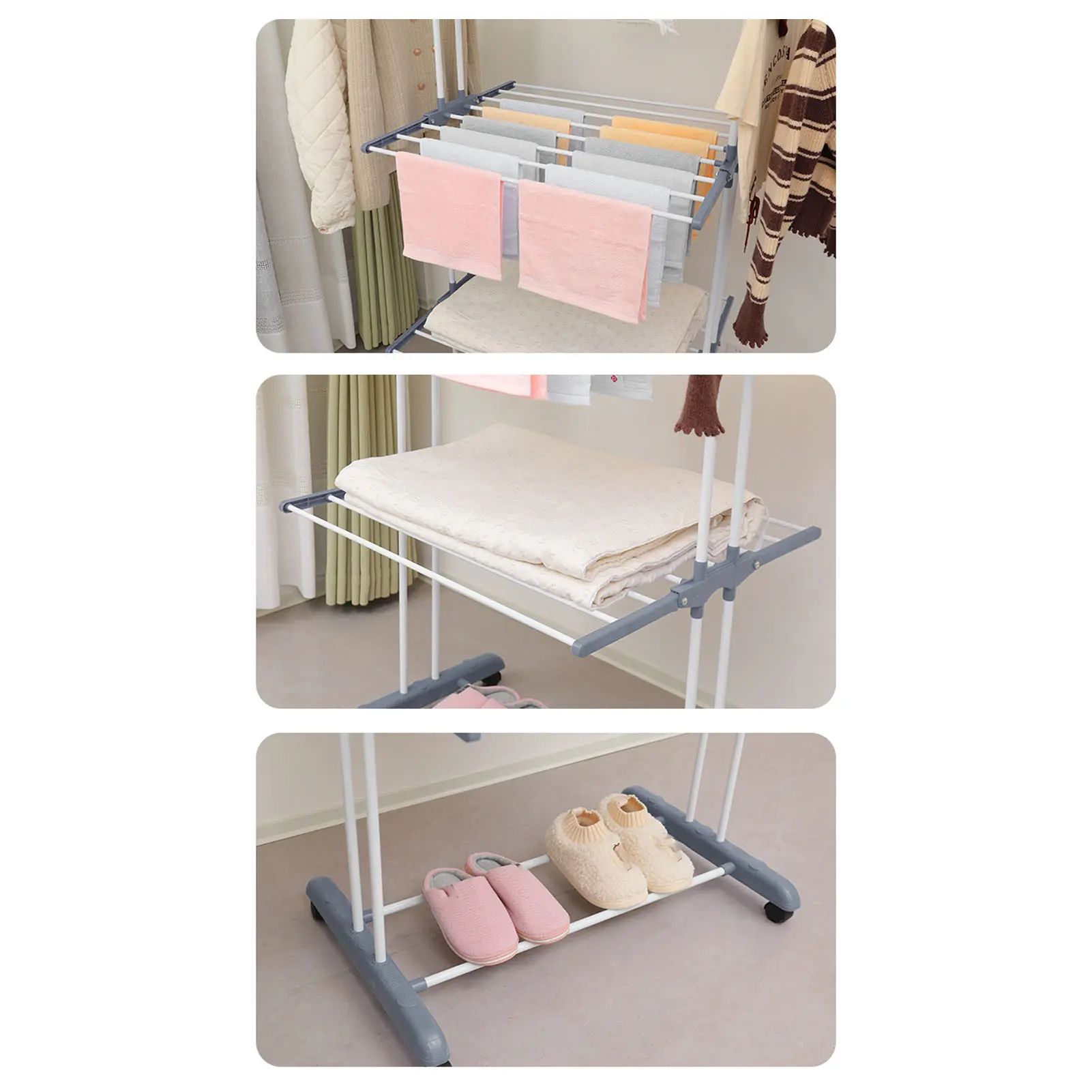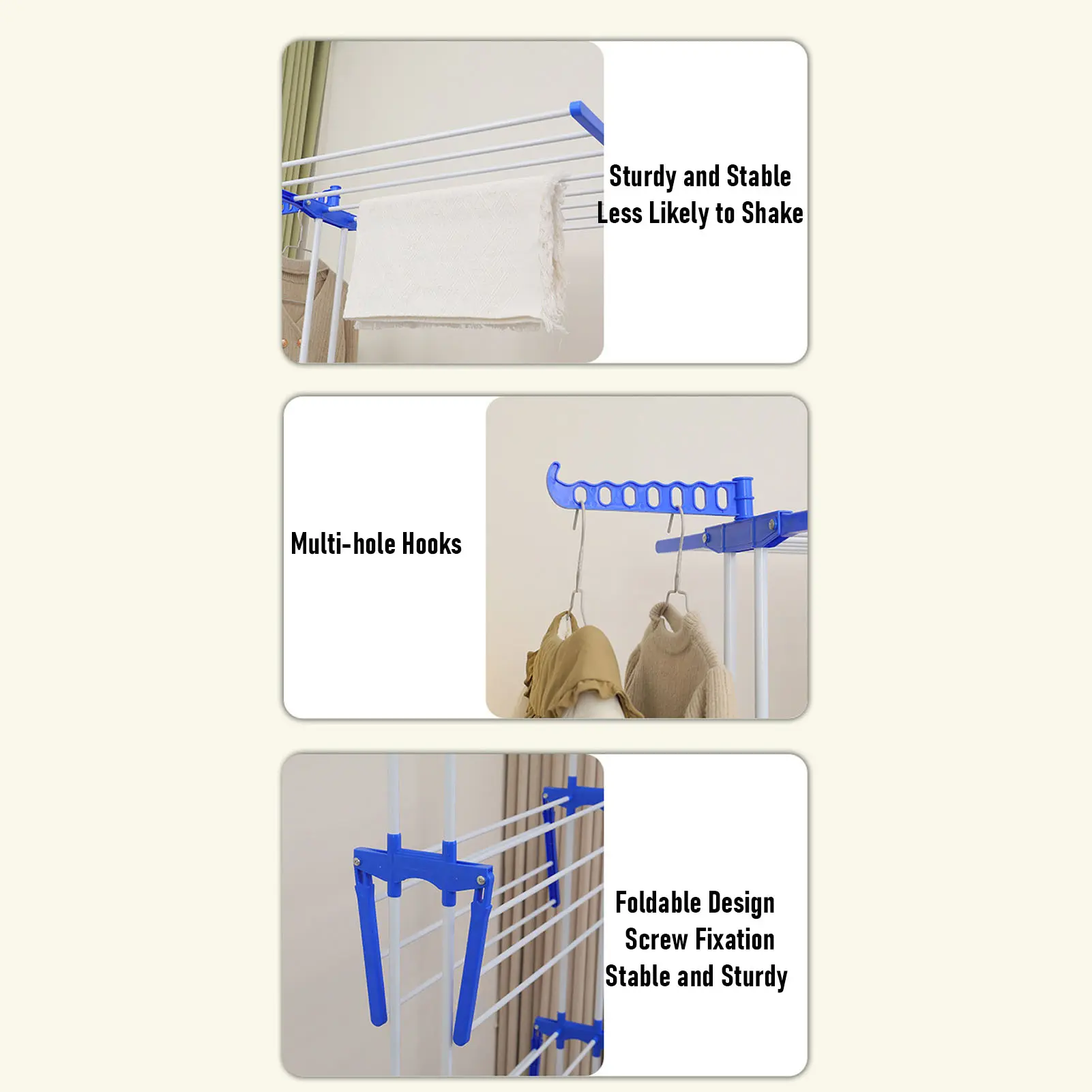 Clothes drying rack, large four-layer foldable drying rack, with four universal wheels for mobility. Multi-functional stainless steel drying rack, blue/gray