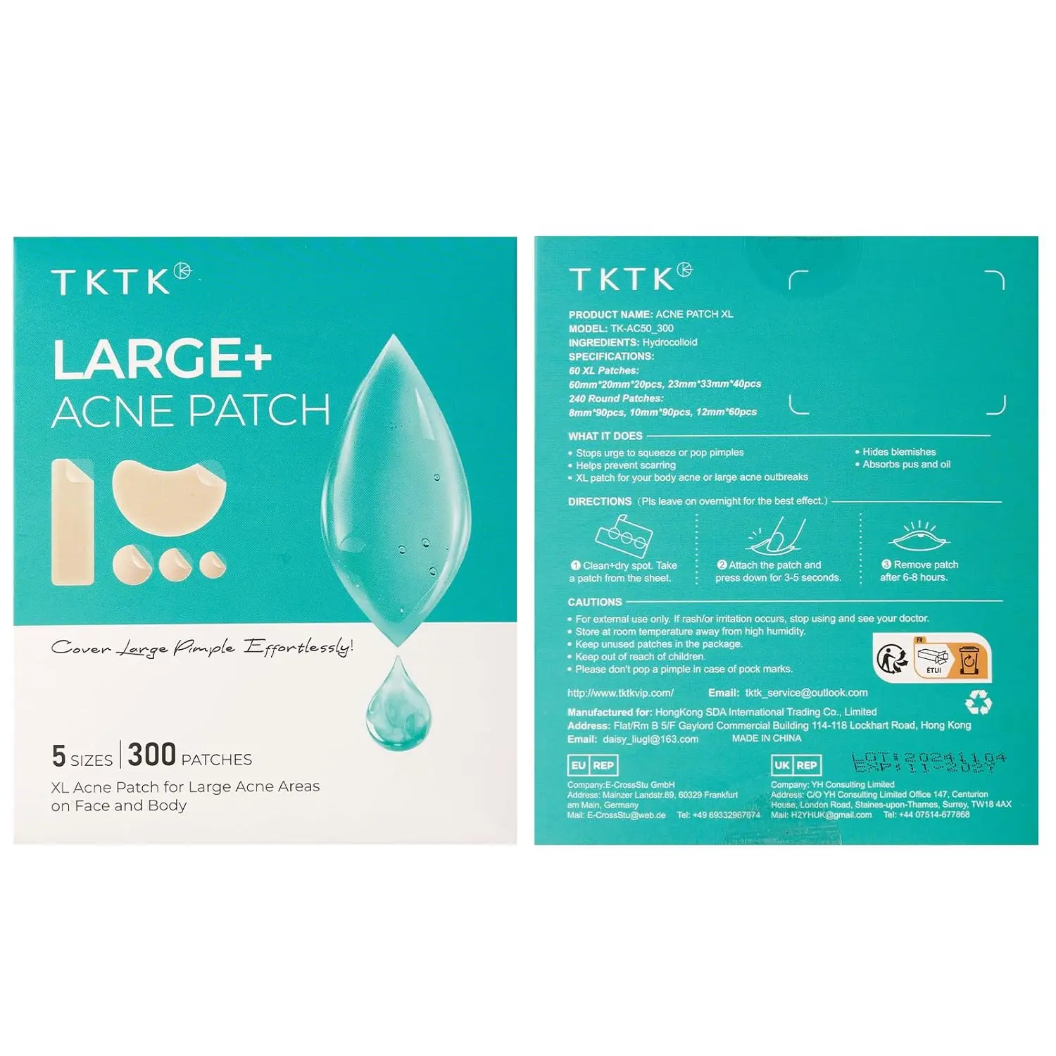 ·5 Sizes 300 Patches: TKTK offers you the more and larger sizes - 60x20 mm XL pore strips, 33x23 mm contoured patches and 8 mm, 10 mm, 12 mm spot patches. These combination zit patches will help you with the smallest of blemishes to the biggest of breakouts