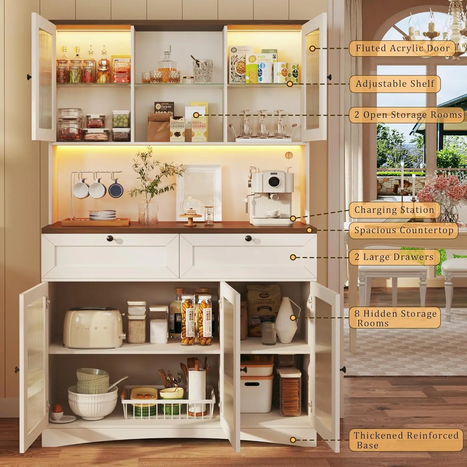 ·Large Capacity & Versatile Pantry Cabinet:This tall pantry cabinet combines a coffee bar, buffet, and storage in one! With 10 compartments, 5 adjustable shelves, 2 deep drawers, and a spacious open countertop, it easily organizes cookware, dinnerware, and pantry essentials. The flexible design adapts to your changing needs while enhancing your kitchen’s style.
