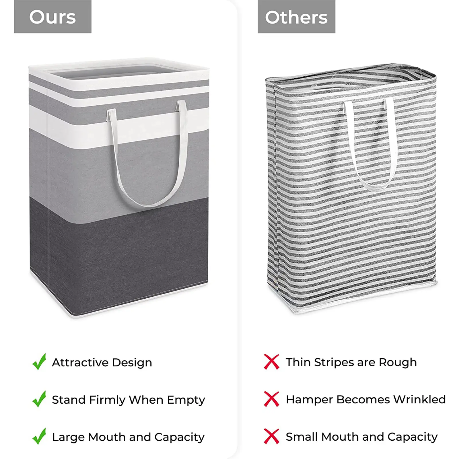 The handles are reinforced with tight, durable stitching to prevent tearing. They are long enough for easy carrying, even when filled. The design allows for one or two-handed handling, making it convenient for daily use. This ensures the hampers are both sturdy and user-friendly.