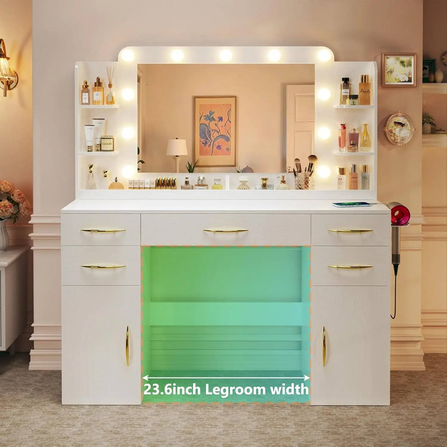 ·Ample Storage Space: The 45.5" vanity desk offers unmatched organization with 1 large drawer, 4 medium drawers, 2 spacious cabinets, 2 side shelves, and 2 makeup trays. Smooth, quiet slides and a built-in hair dryer rack add to its convenience.