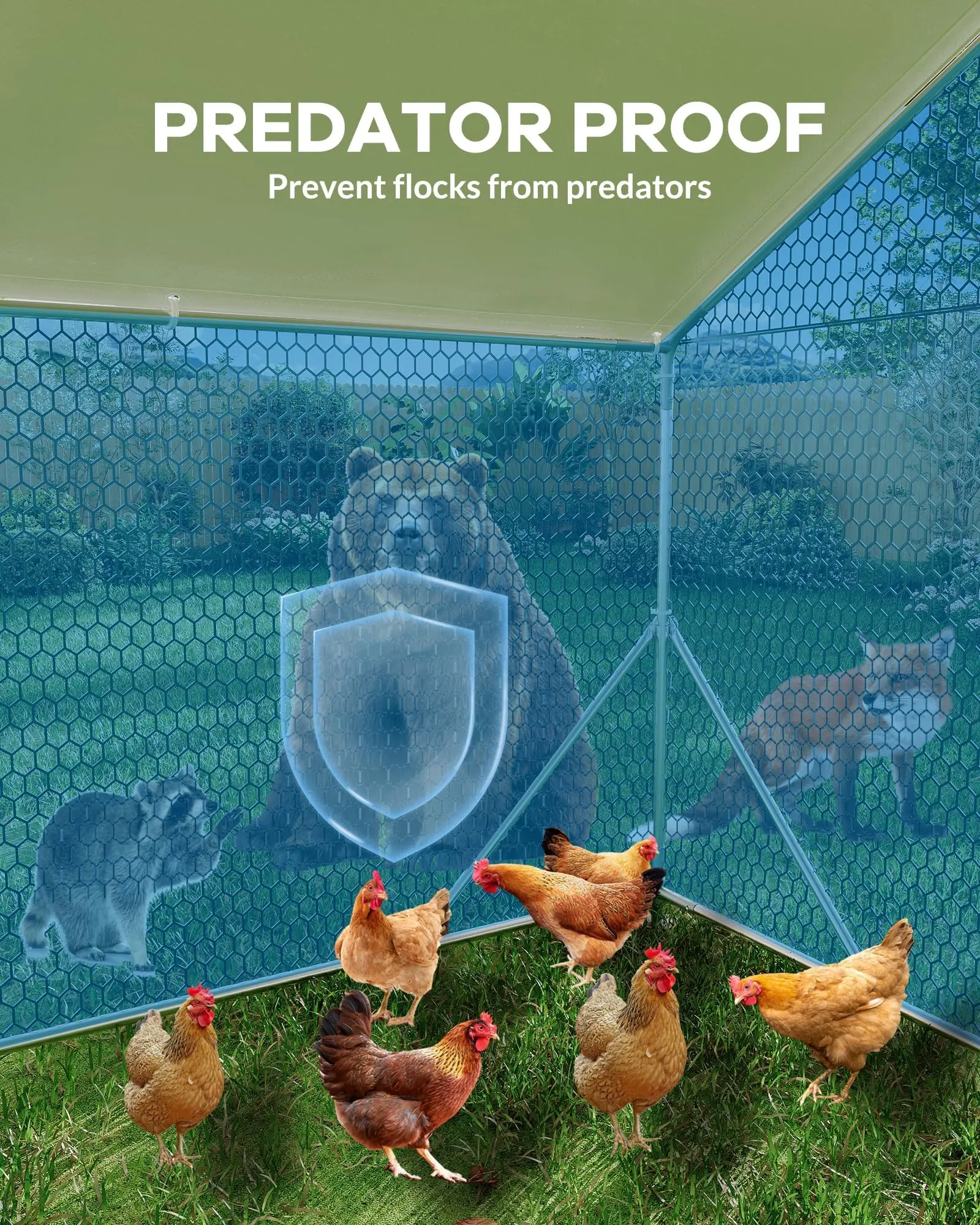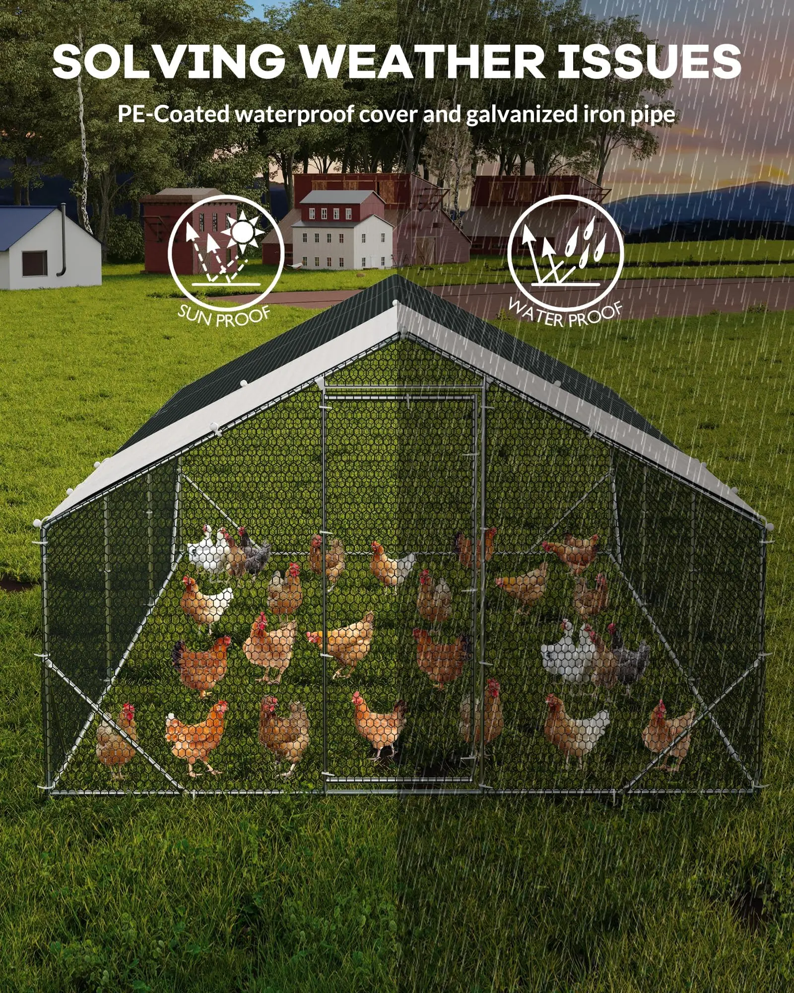· All-Weather Chicken Pen Protection: The included PE waterproof cover features UV resistance and a sloped roof to shield your chicken pen from sun, rain, and debris, ensuring a dry and protected environment year-round