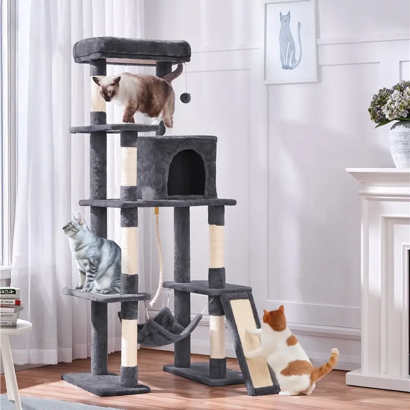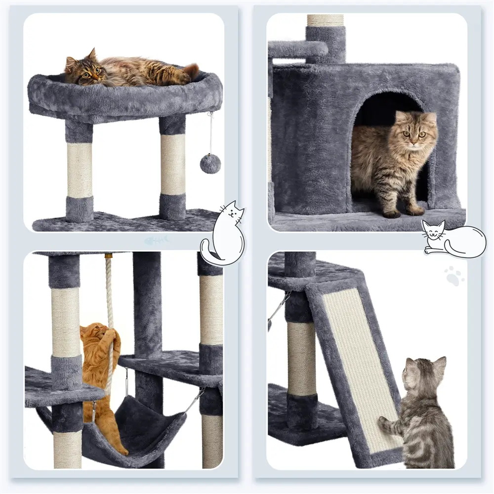 2. Interesting Layouts: Cats can hide in the condo, nap in the lower hammock, or enjoy views from the top perch. Scratching posts, ladder, hanging ball, and rope add extra fun.