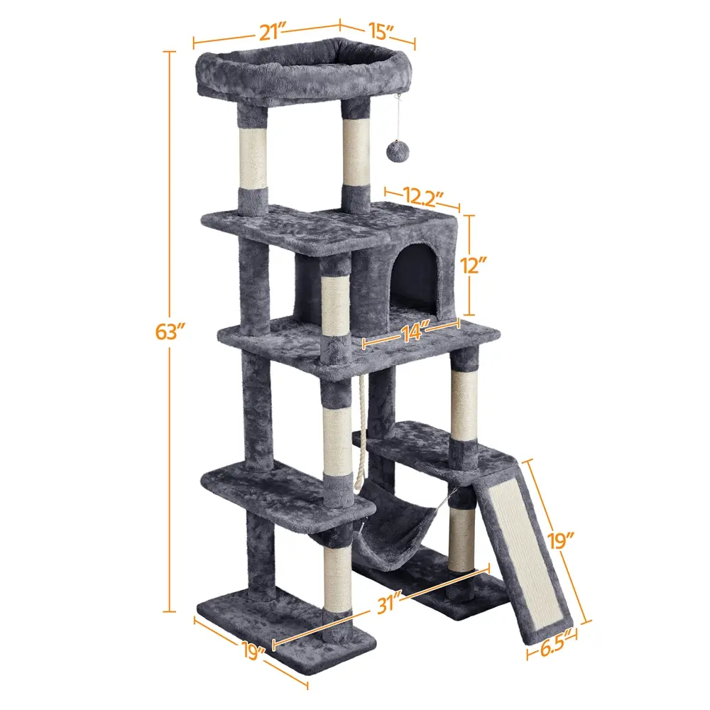 4. Strong Load Capacity: Top perch holds 17.6lb, condo 22lb, hammock 17.6lb, and small board 11lb. Suitable for small or average-sized cats.