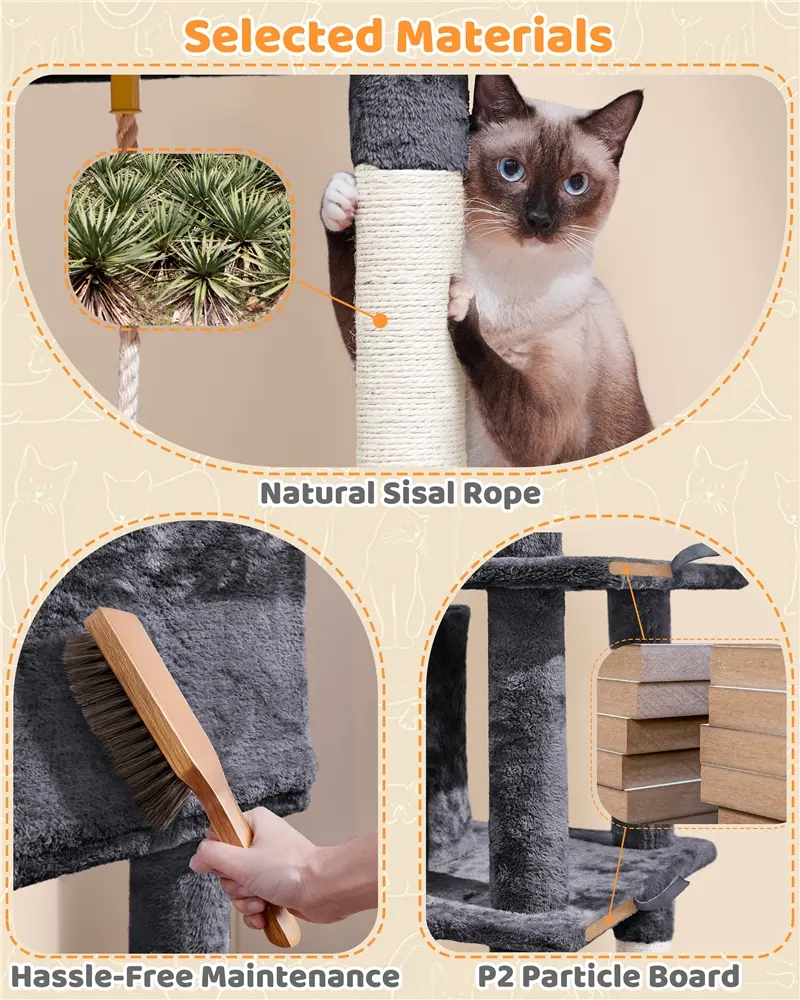 3. Quality Materials: Made from CARB P2 particleboard, plush, sisal rope, paper tube, plastic, and iron. Covered in soft plush for comfort and built for stability.