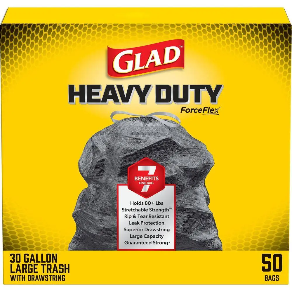 5. Glad 30 Gal. Heavy Duty Large Drawstring Outdoor Unscented Black Trash Bags (50-Count), Rip Tear and Leak Resistant, Superior Drawstring for Indoor and Outdoor Tough Jobs, Large Capacity Garbage Bags.