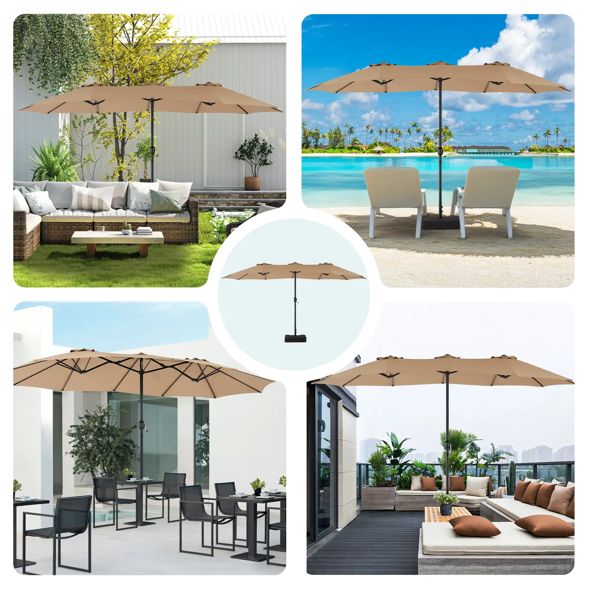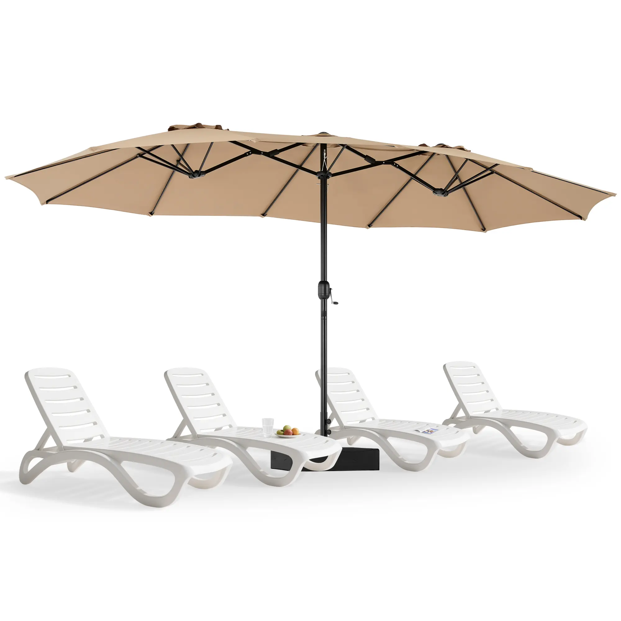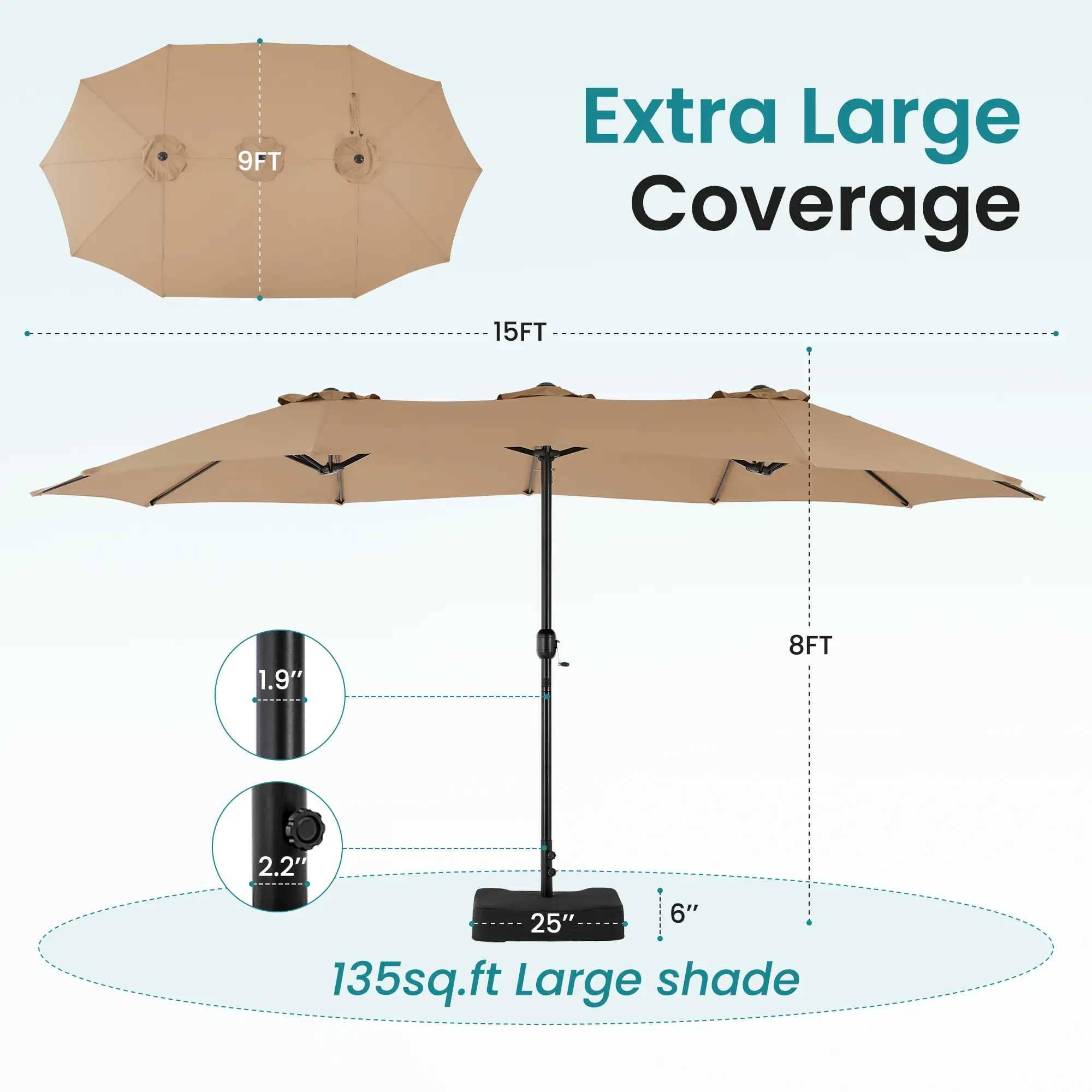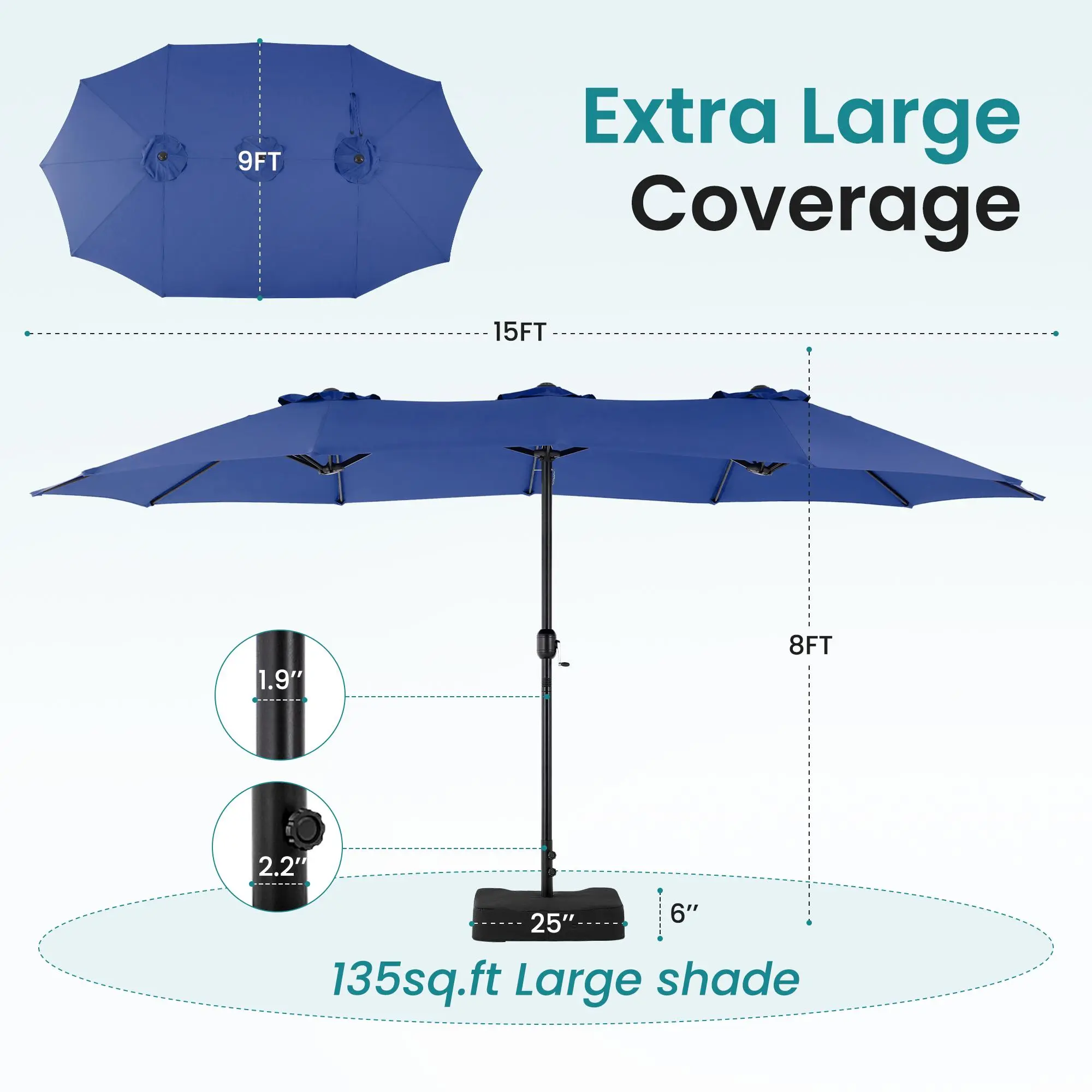 This large patio umbrella comes with a base included, making it ideal for poolside, lawn, and backyard settings. The umbrella provides ample shade for your outdoor space, ensuring comfort in various outdoor areas.