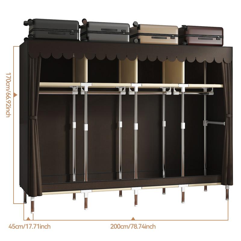 • The top space can hold unused large items like suitcases. Four storage areas on top are ideal for folded clothes, bags, pillows, and hats. Four hanging areas suit coats, pants, and skirts. The bottom space stores shoes, small boxes, etc.