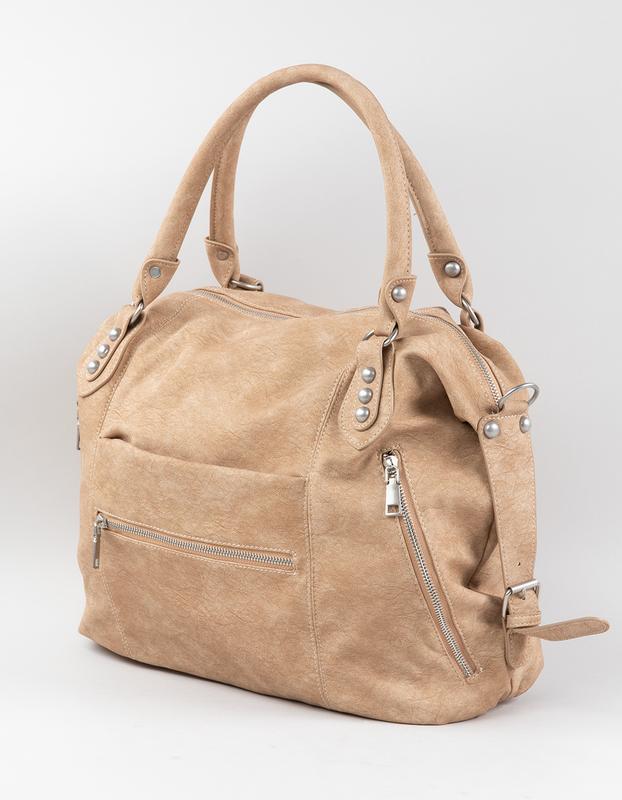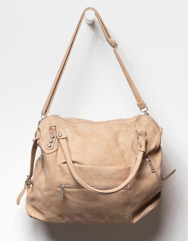 Large Slouchy Shoulder Bag. The Large Slouchy Shoulder Bag combines style and functionality in one versatile design. Crafted from smooth faux leather, this roomy bag features top carry handles and an adjustable shoulder strap for comfortable, customizable wear. Silver-tone buckles and accents add a polished touch, while the spacious main compartment with a zip closure keeps your essentials secure. Three zip pockets on the front offer easy access to smaller items, and an additional zip-up pocket inside helps keep everything organized. Measuring approximately 16" wide, 13" high, and 6" deep, it's the perfect everyday bag for carrying it all in style. Polyurethane exterior, polyester lining. Imported.