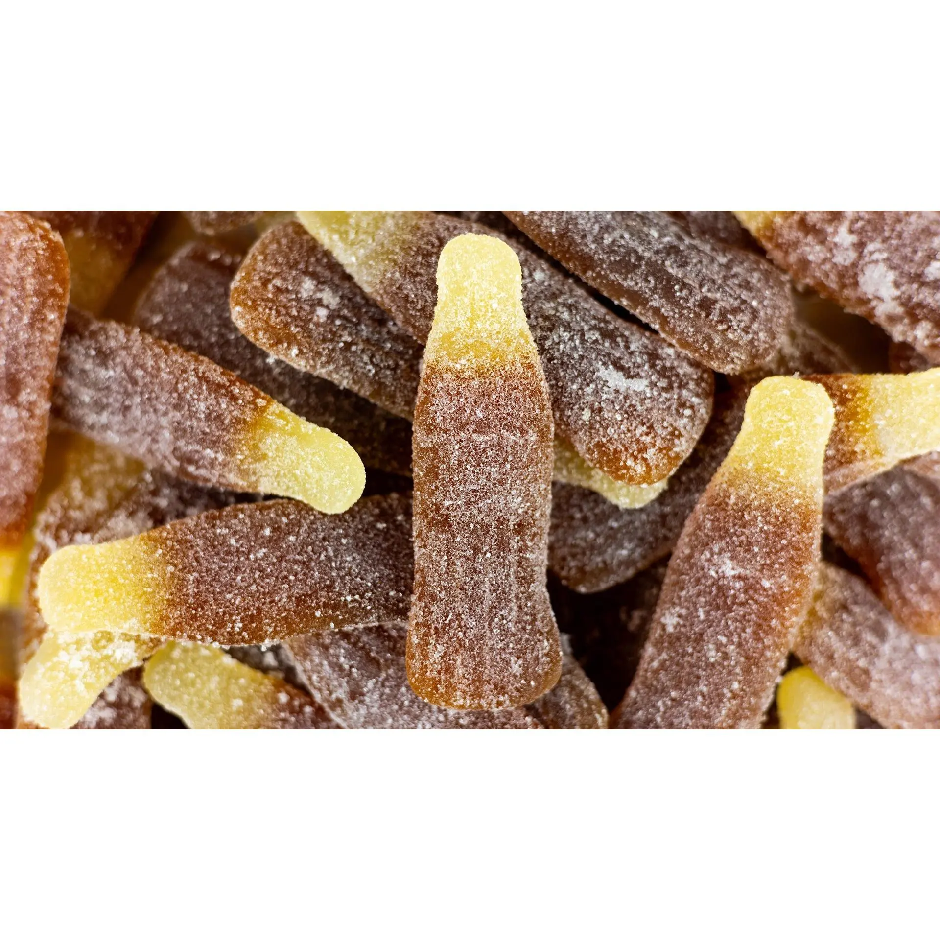 Large jelly cola bottles coated in sour sugar.