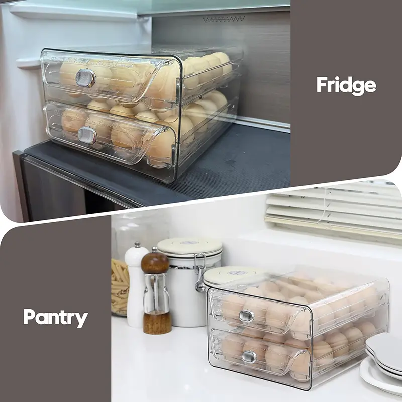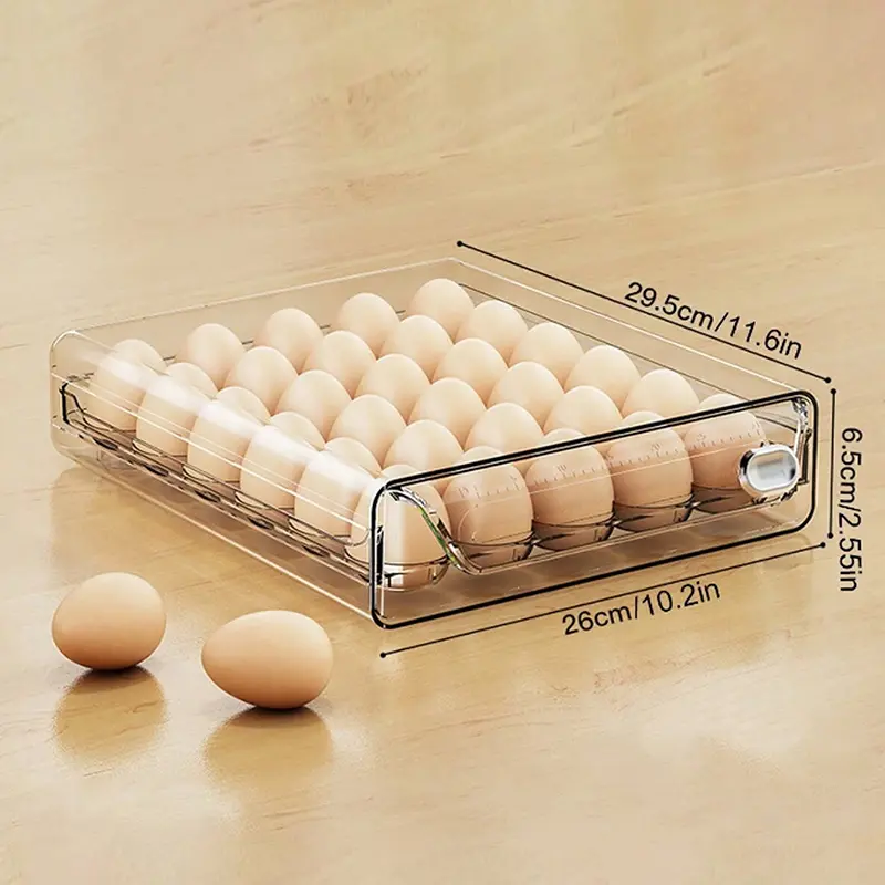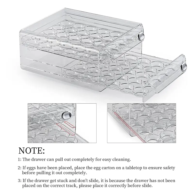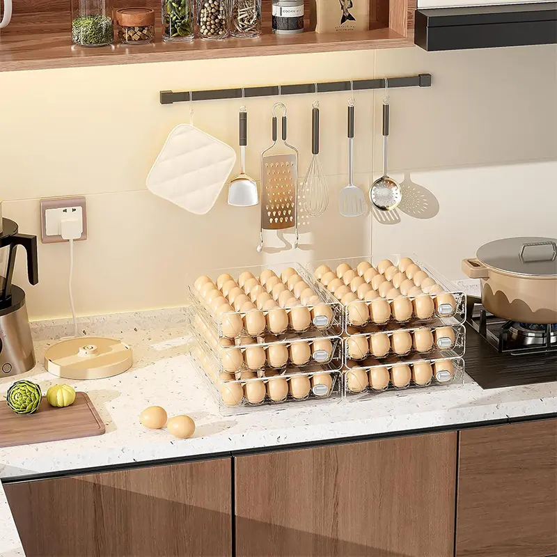 Keep eggs fresh, organized, and easy to access with this Large Stackable Egg Storage Box! Designed with a 60-egg large capacity, built-in freshness timer, and anti-roll structure, this transparent container keeps eggs securely stored in the fridge or kitchen counter. The stackable design saves space, while the clear shell lets you check egg quantity at a glance. Perfect for daily family use, meal prep, and keeping your refrigerator tidy and hygienic.