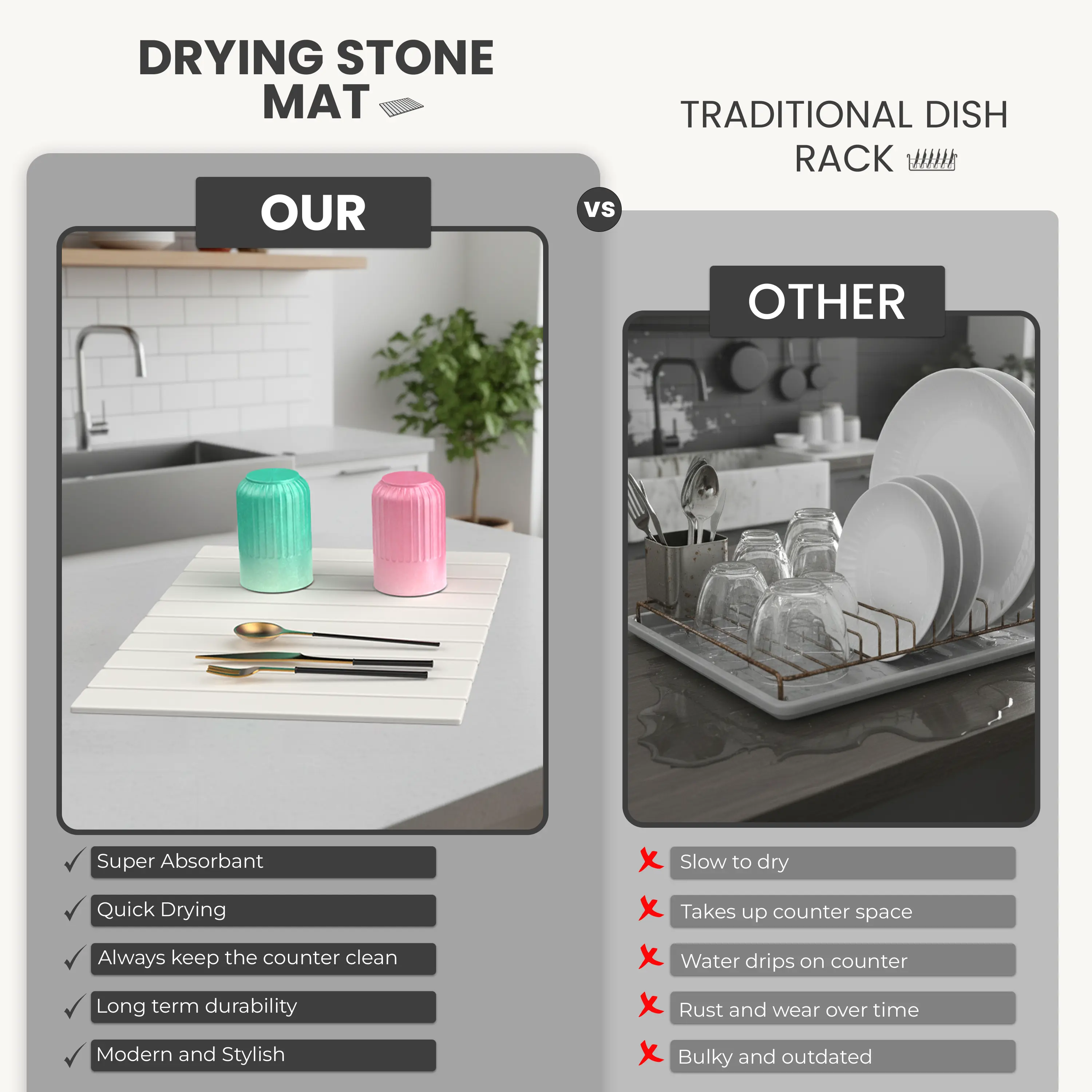 【60-Second Fast Absorption, No More Wet Countertops】 Just place your washed dishes on the mat — water is absorbed in seconds! No dripping, no pooling, just a dry, tidy countertop. Plus, it helps reduce kitchen odors. Say goodbye to slippery, moldy surfaces!