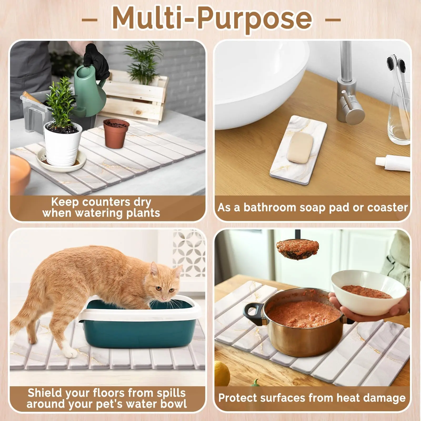 ·【Wide application】Collapsible stone dish drying mat helps maintain a clean kitchen, ensuring your surfaces stay neat and fresh. The large stone drying mat acts also as a heat-resistant mat, protecting countertops from hot pots and pans. kitchen drying mat also doubles as a bath mat, plant saucer, or pet feeding mat, offering flexibility for various home uses.