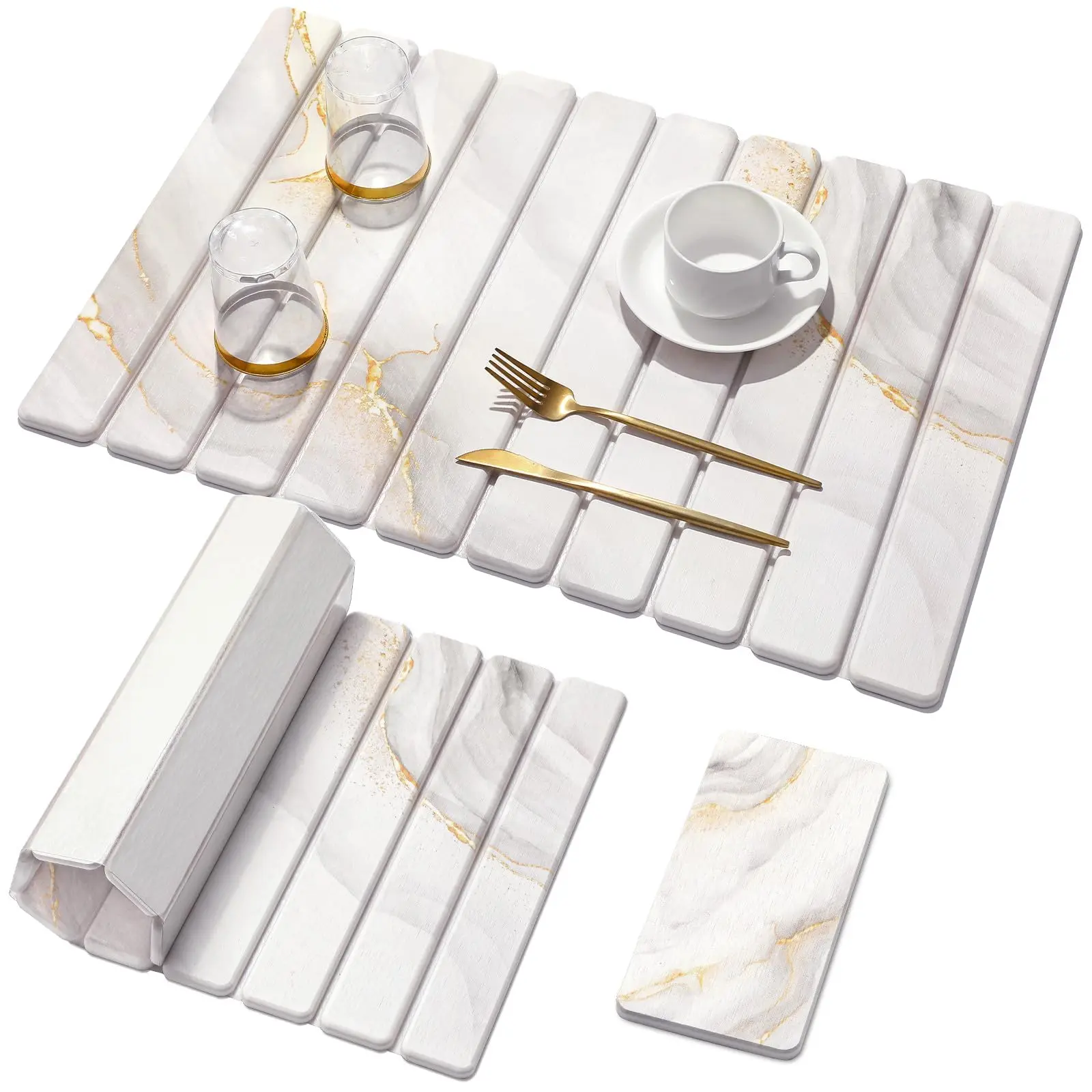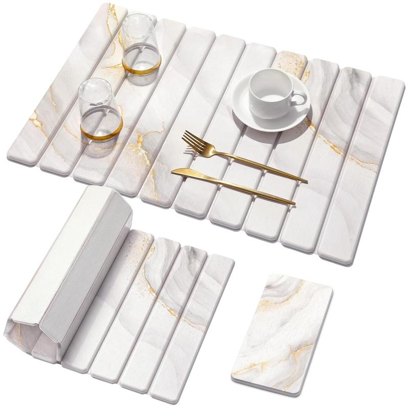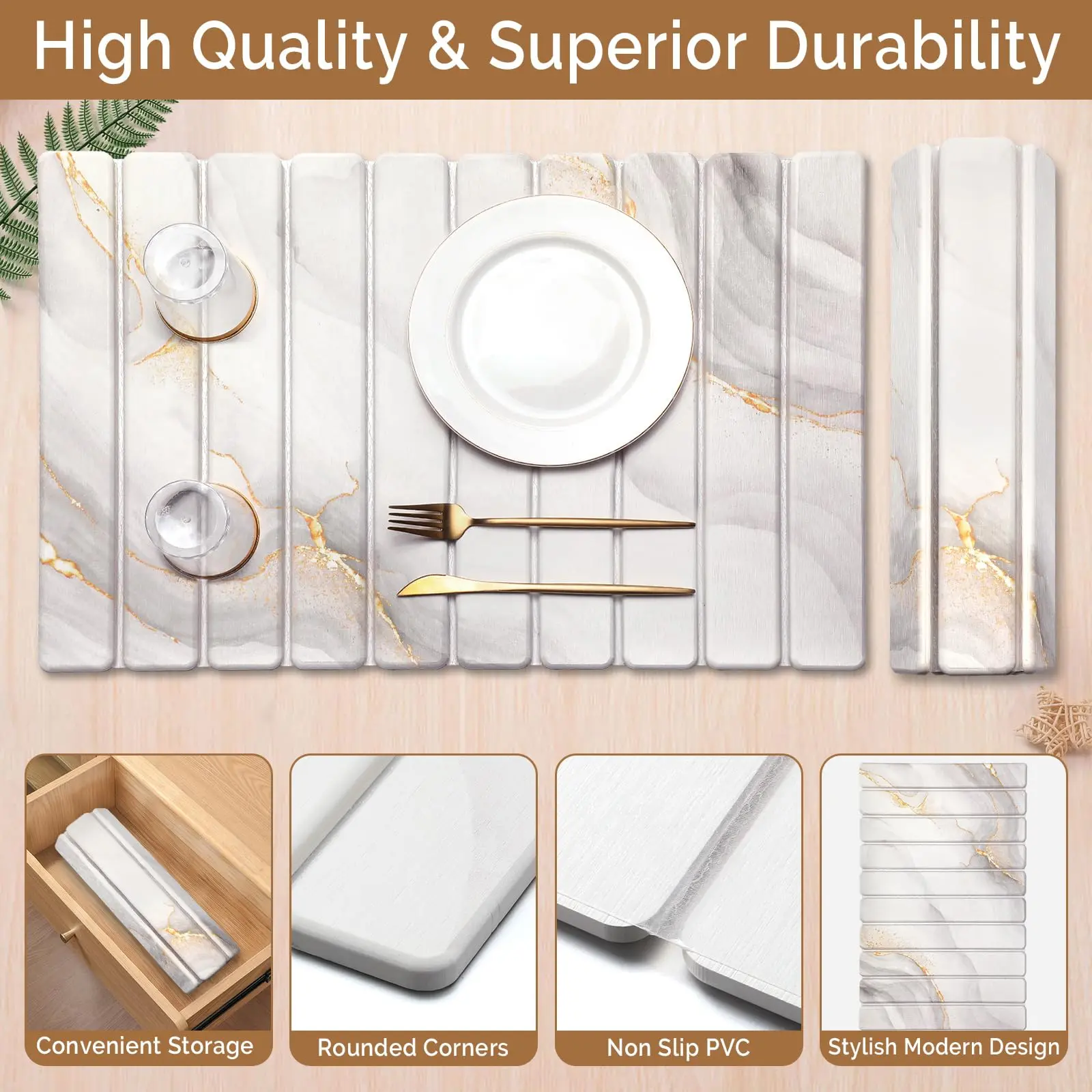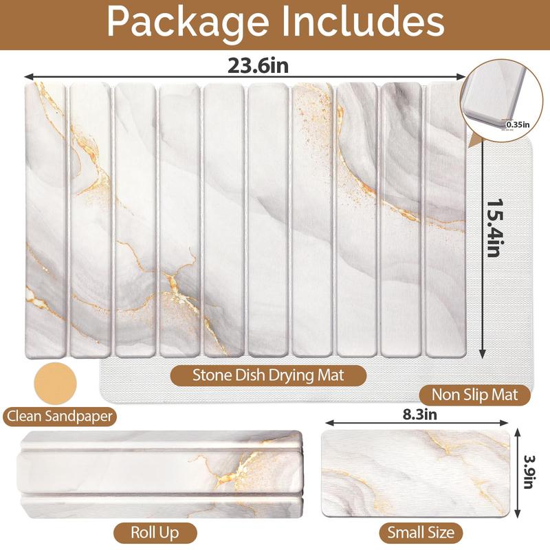 ·【Elegant Marble Pattern】The water absorbent drying mat features an elegant design inspired by stone, with a white base highlighted by refined gray and gold marbling. This color combination adds a touch of luxury and style to your kitchen, enhancing its overall aesthetic.
