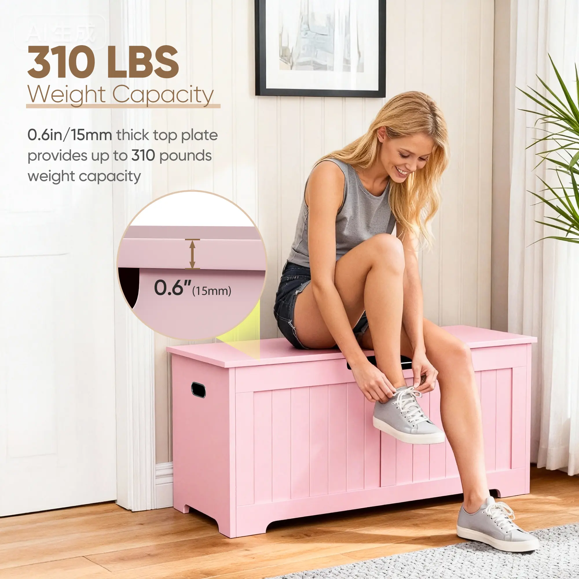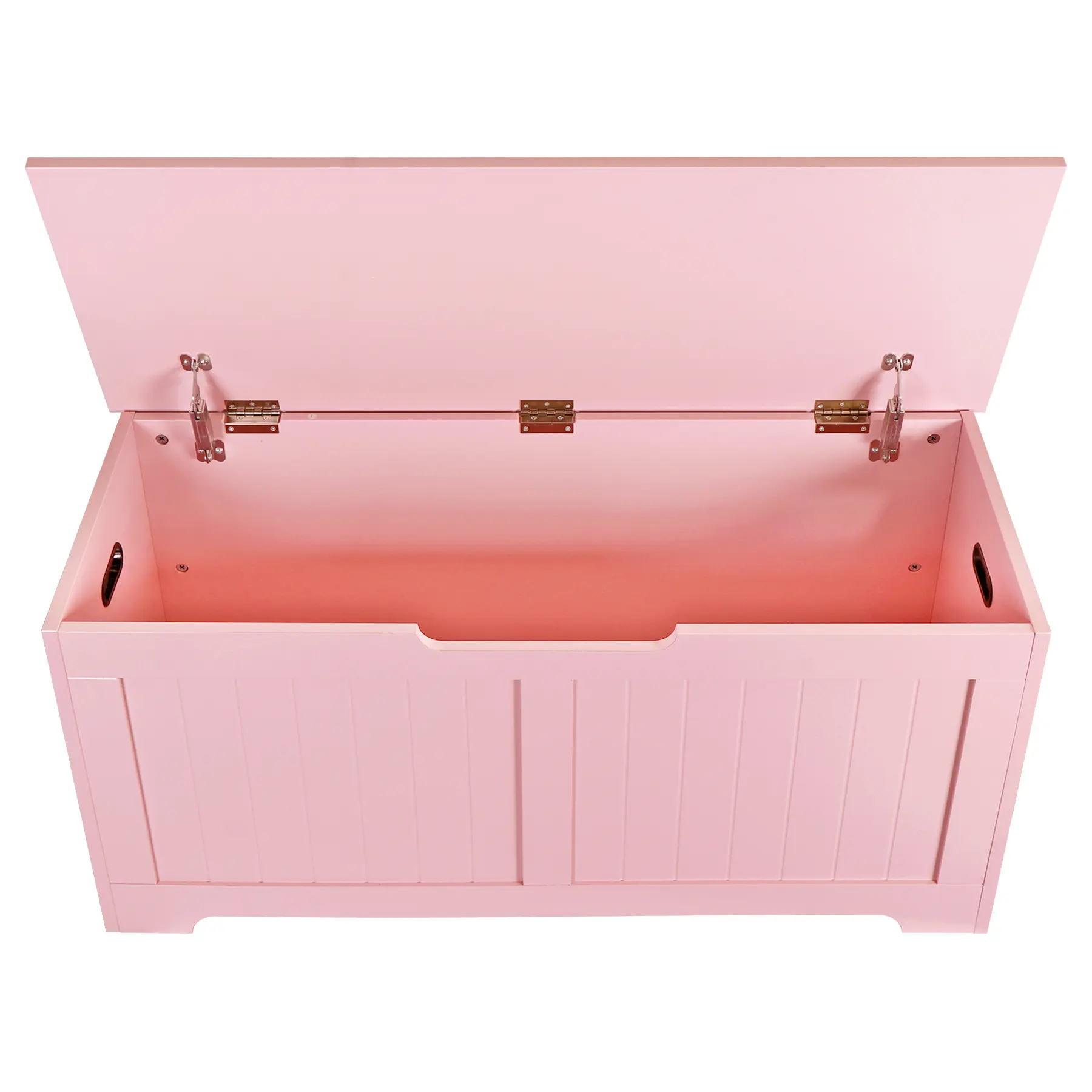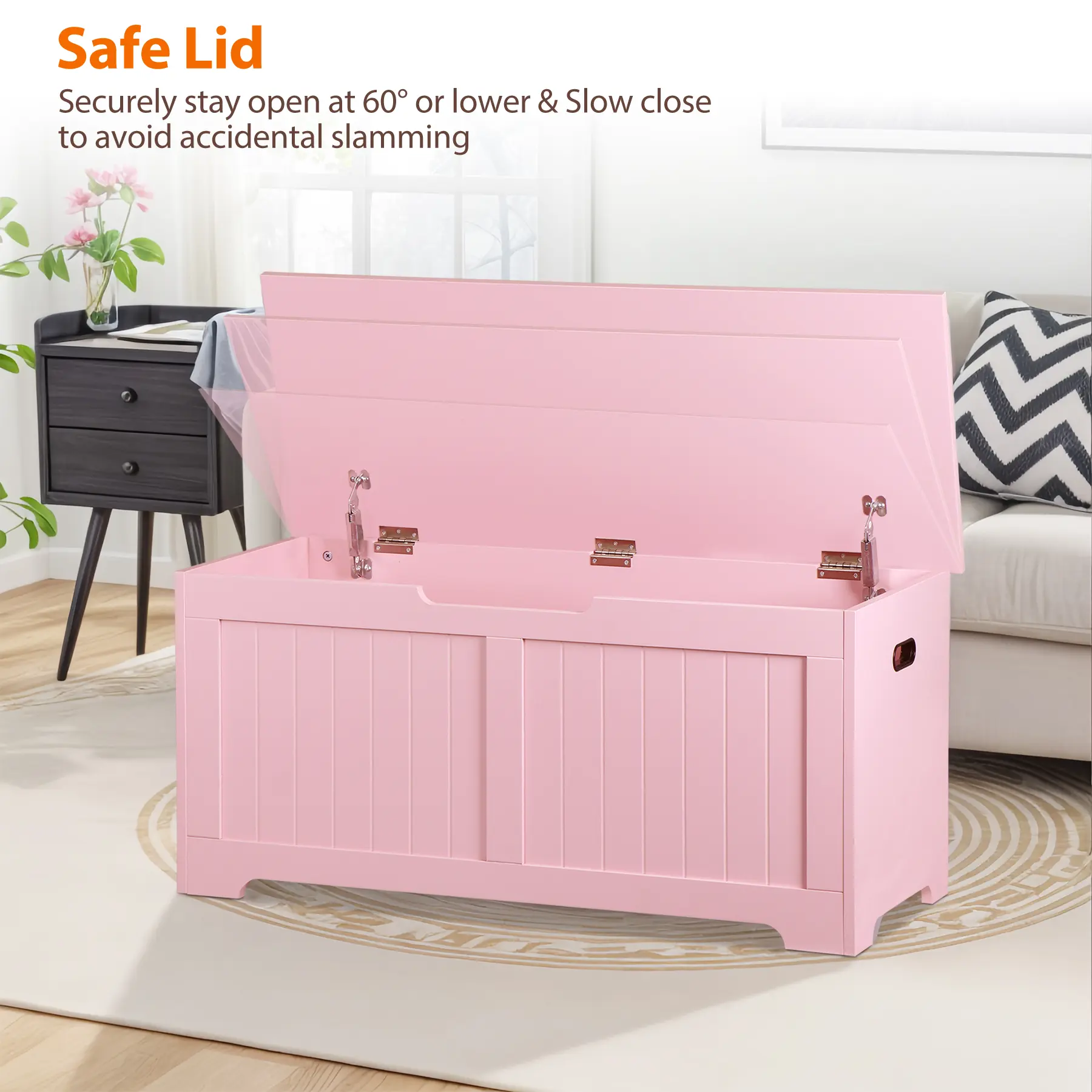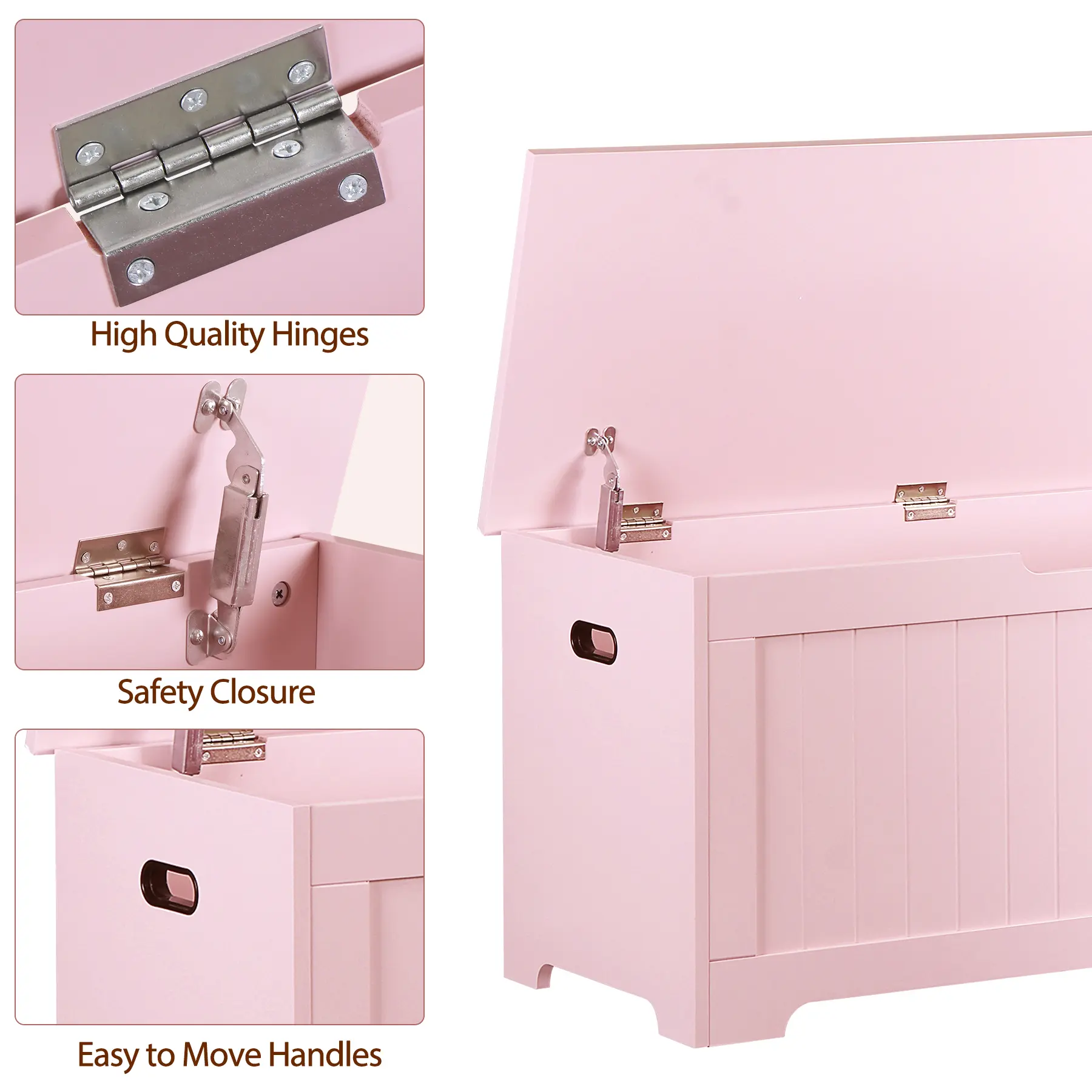 A generous storage chest gives more space to store toys, stuffed animals, books, blankets, pillows, and more. Designed with safety in mind, the chest features protective safety hinges that prevent sudden closing. The cut-out handles are easy to move. The cute color look, this storage chest is not only a piece of furniture to keep the bedroom tidy and organized but also a fancy addition to your home. It works as a bedside stool, seating, shoe bench, or entryway bench - blending into any decors while keeping your space tidy.