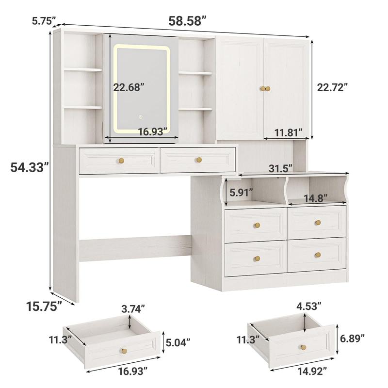 ✨ This vanity desk combines a makeup table with a chic nightstand, offering ample storage. The left side features a wide clear tabletop, 2 drawers, and 9 open shelves. The right side includes 4 drawers and 6 open shelves. Everything has its place, eliminating clutter. Perfect for a bedroom or dressing room.