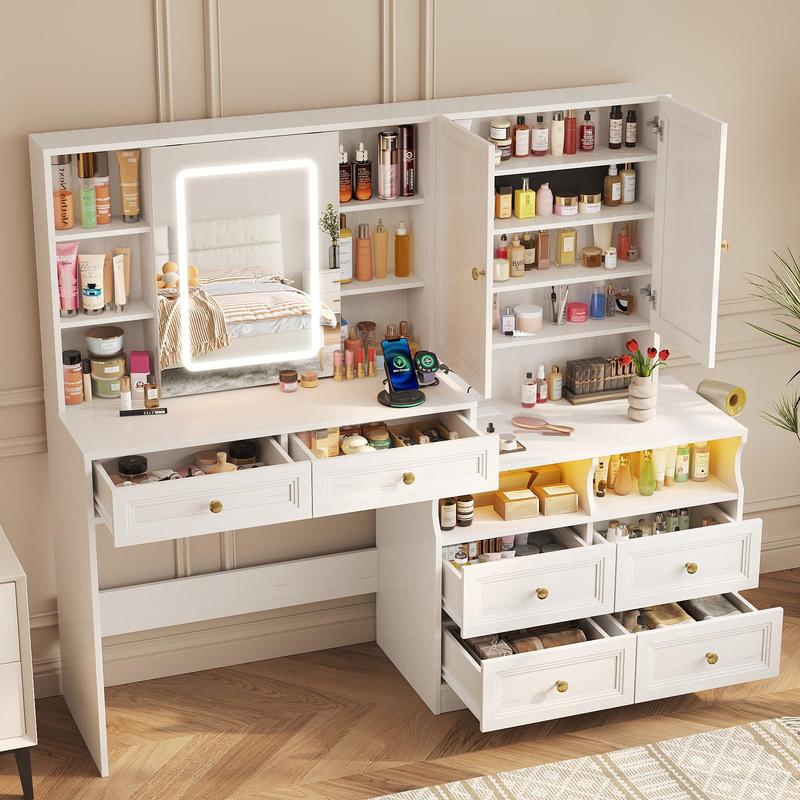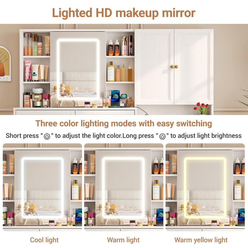 💡 The sliding LED mirror comes with 3 light modes: warm, cool, and natural. A hidden 3-tier organizer keeps your favorite products organized. The nightstand's LED-lit shelves ensure your essentials are visible, adding sophistication to your space.