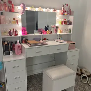 ·Makeup Vanity with Ample Storage:There are more than 17 storage areas on the makeup vanity.8 large wooden drawers and 3 ares desktop and 4 open shelves on the desktop. You can sort all of your jewelry, hair accessories, hair care products and cosmetics. You can sort all your items easily and different areas can fit all your needs.