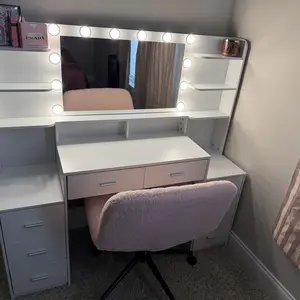 ·Vanity Set with Charging Station: Our vanity set with a charging station on the right side cabinet. There are 2 plugs and 2 USB ports to fit your different devices. It's so convenient to charge any devices beside you. When you enjoy the makeup, you and use the hair curler and charge your phone at the same time.
