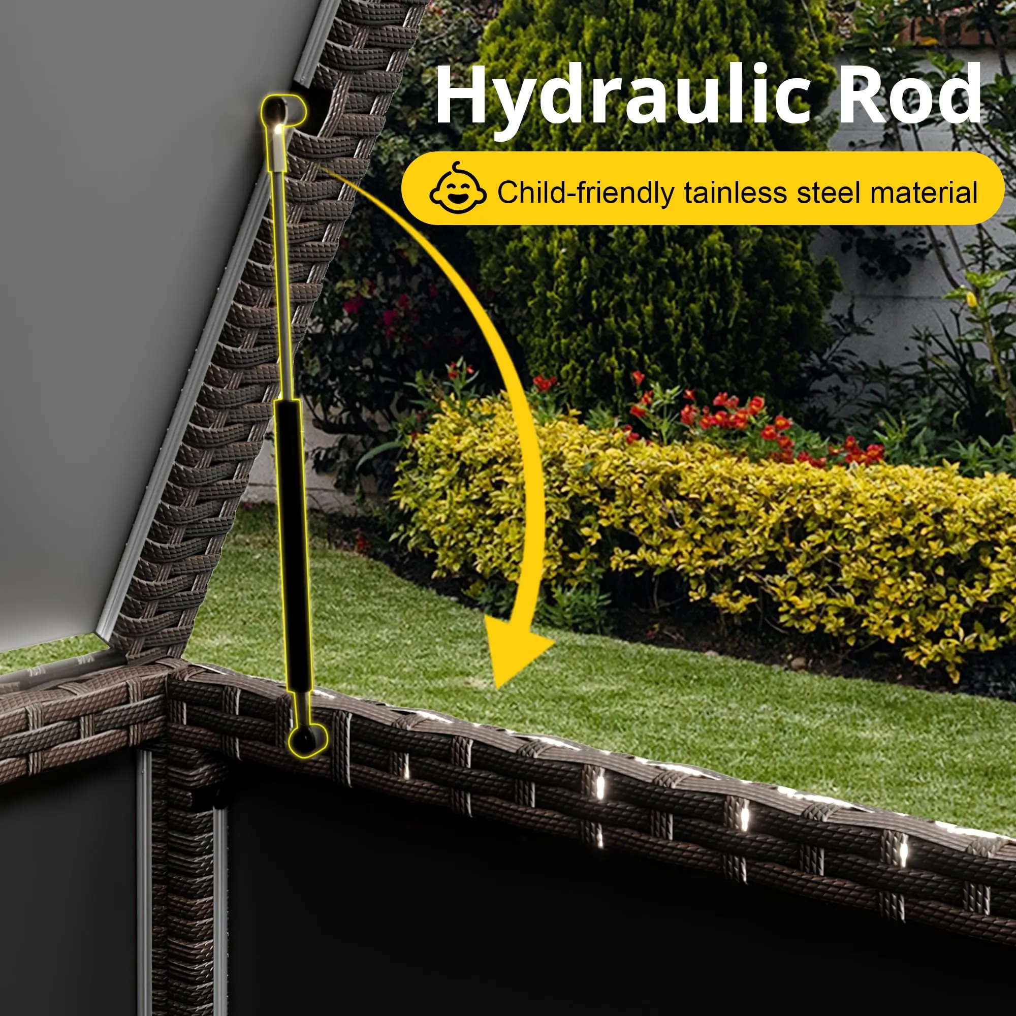 [ Upgraded Waterproof Liner] : Our Rattan Outdoor Storage Box features an upgraded 100% waterproof liner to keep the contents of the storage chest dry and tidy at all times. The top is constructed with a powder-coated galvanized frame and PC panel lid, ensuring exceptional weather resistance. This deck box is not only waterproof but also rust-proof and UV-resistant, capable of withstanding various harsh weather conditions.
