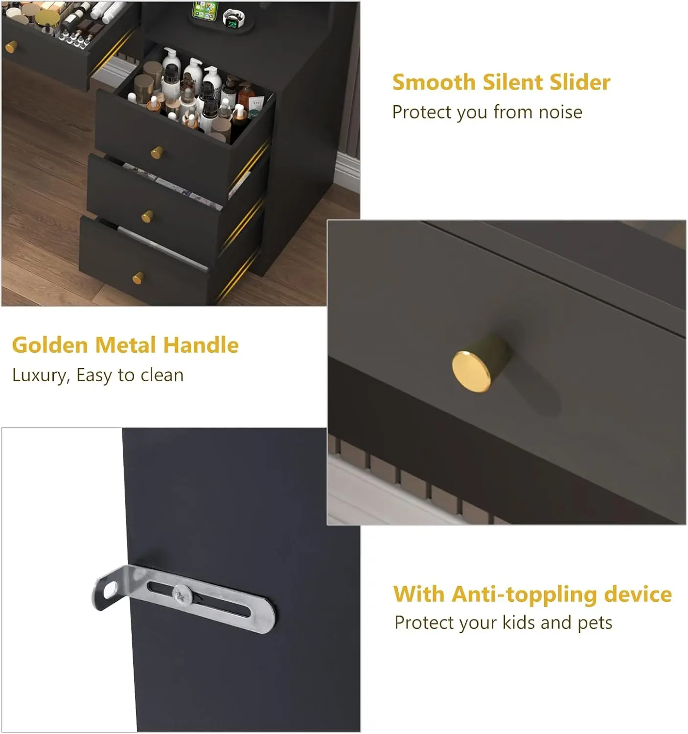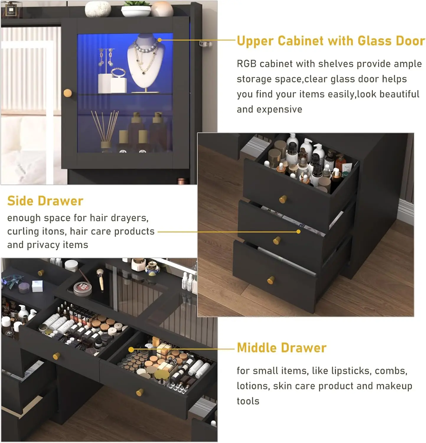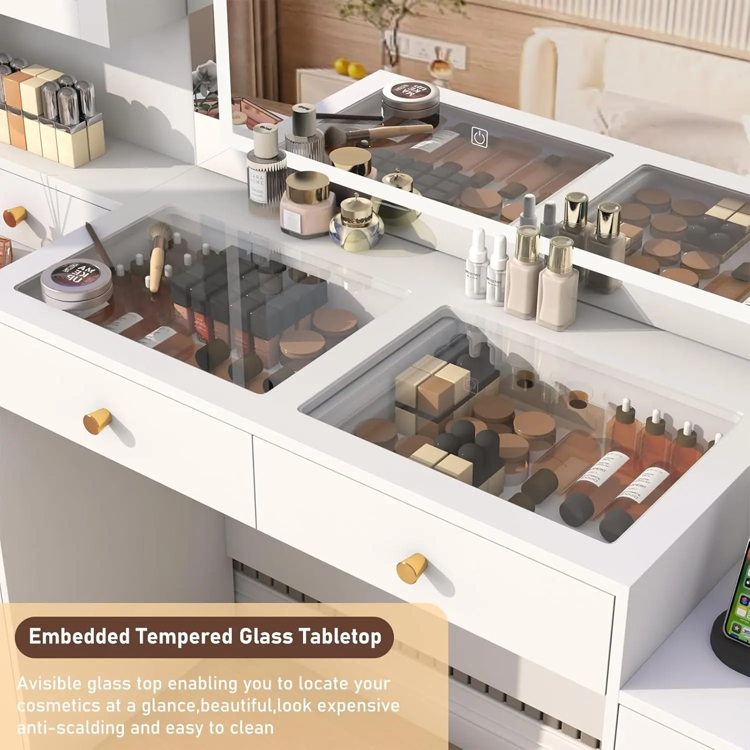 ✨ Large Glass Desktop: The tempered glass design allows clear visibility of items in drawers. It enhances the vanity's appearance, making it look more expensive and advanced. No more hassle of finding items!