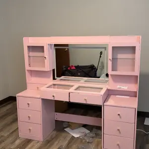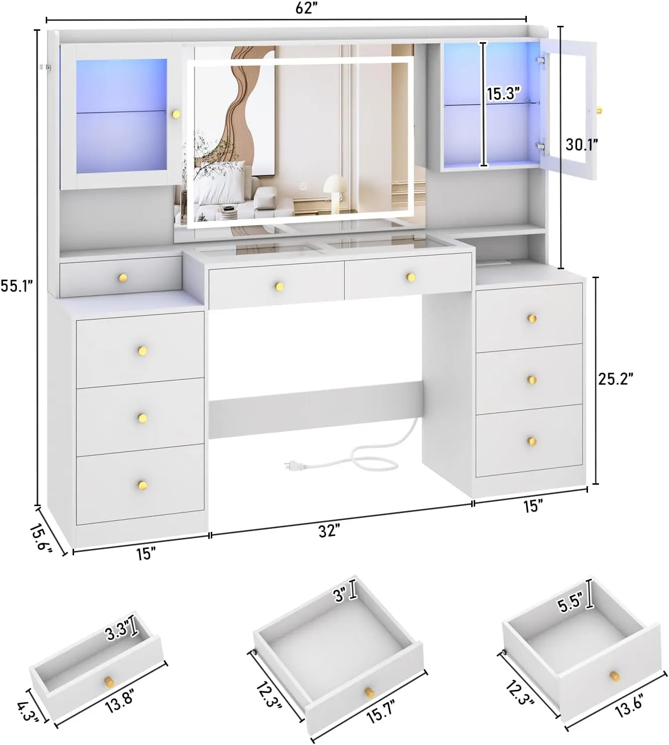 ✨ 62-inch Large Vanity: With 9 drawers and 2 RGB cabinets, it provides ample storage. Open shelves add extra space for jewelry, hair accessories, and cosmetics. The back contains an anti-tipping device for safety.