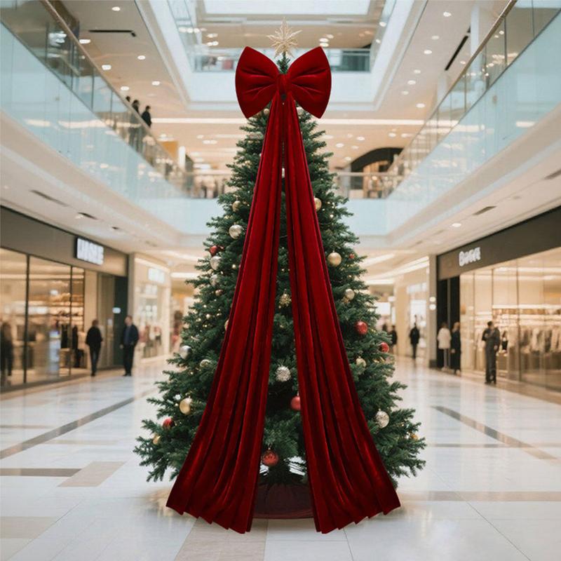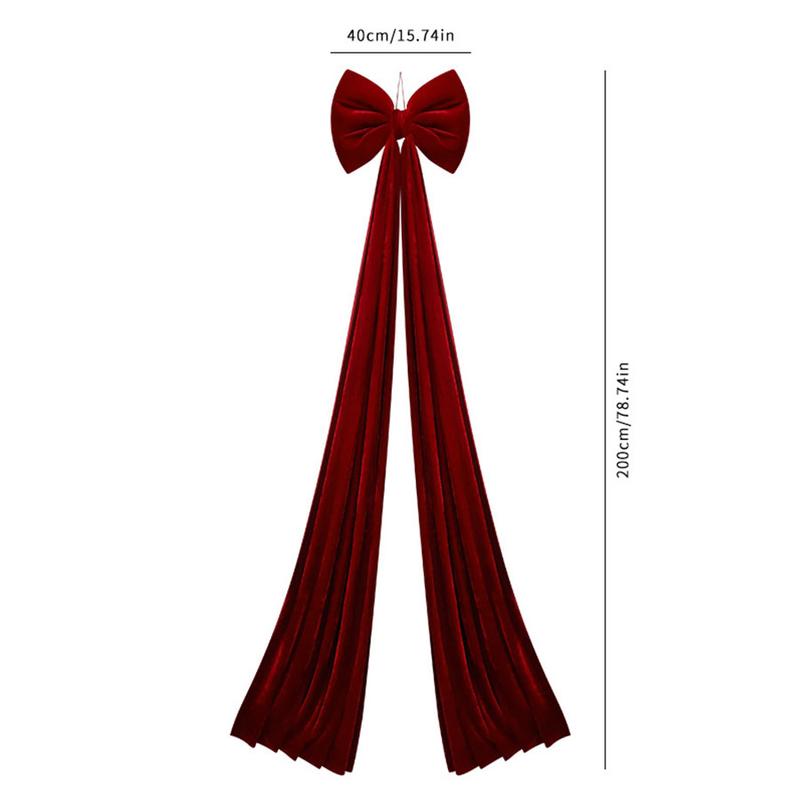 Great for the price. Velvety. The darker option is still red just dark bc of the velvet. Now isn’t cute overall but big enough. The bow pops open even after being shipped tightly and has a loop to hang off your tree. My tree is 7.5 feet and the tails didn’t touch the floor but I didn’t like how it looked straight down so I made a curtain effect. Love the look overall.