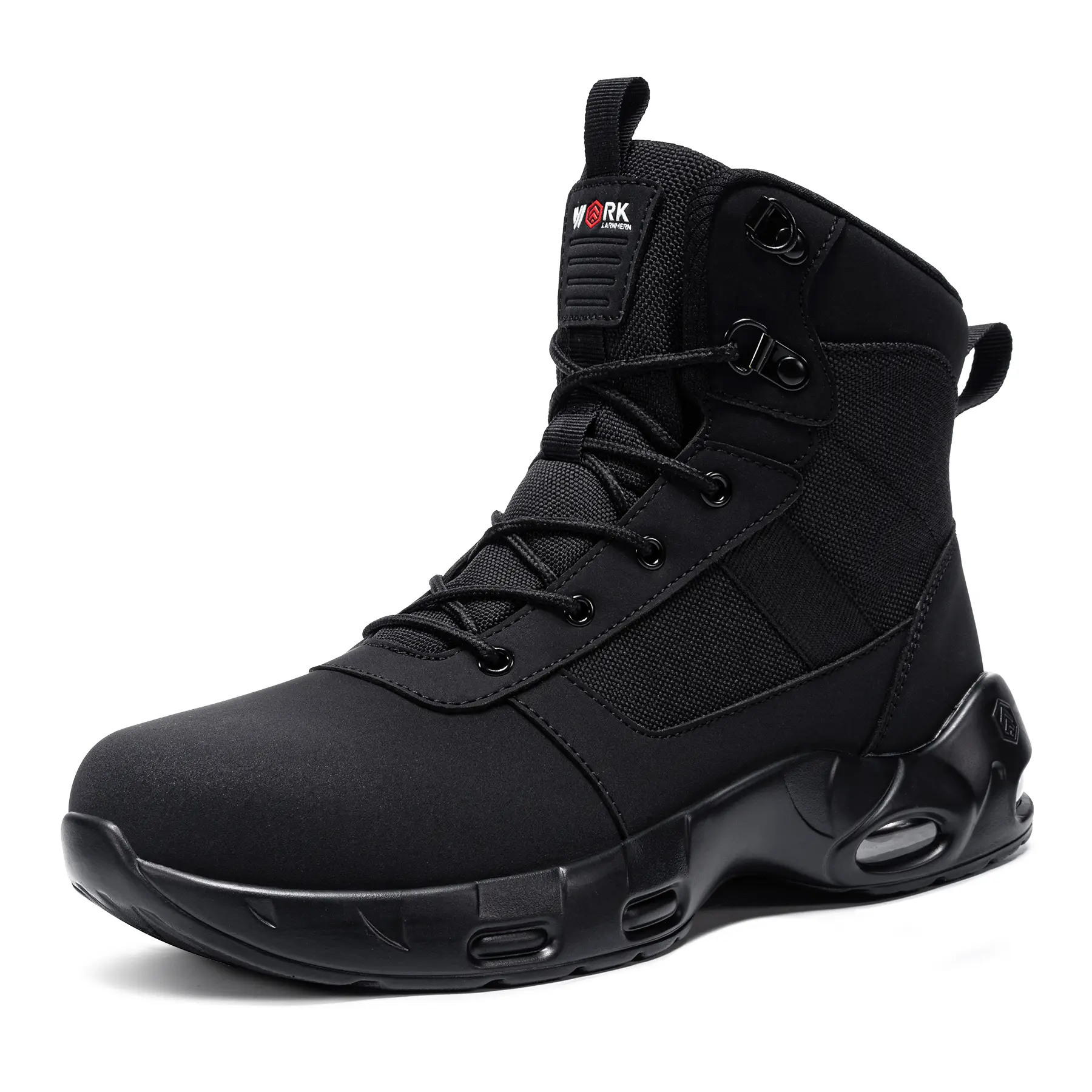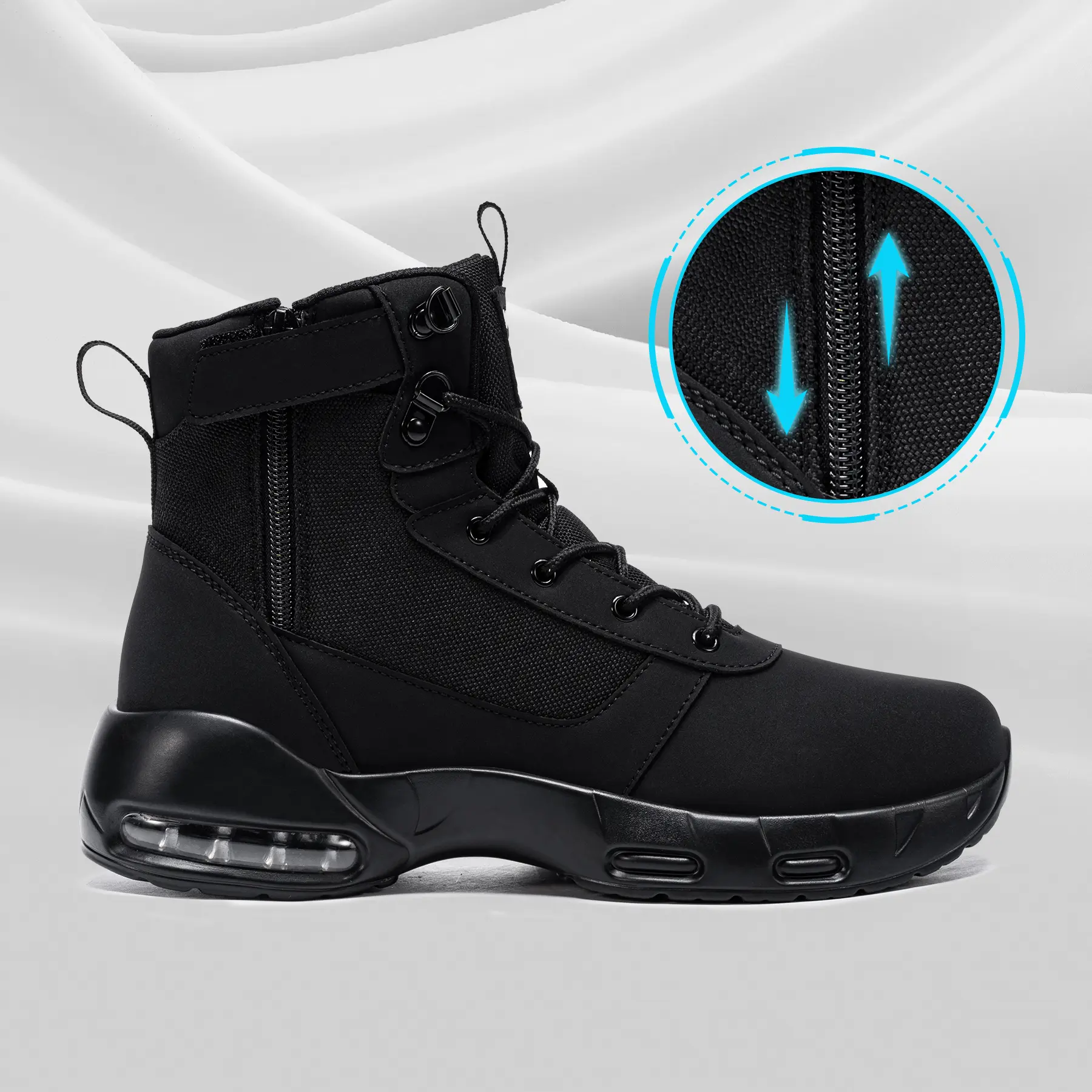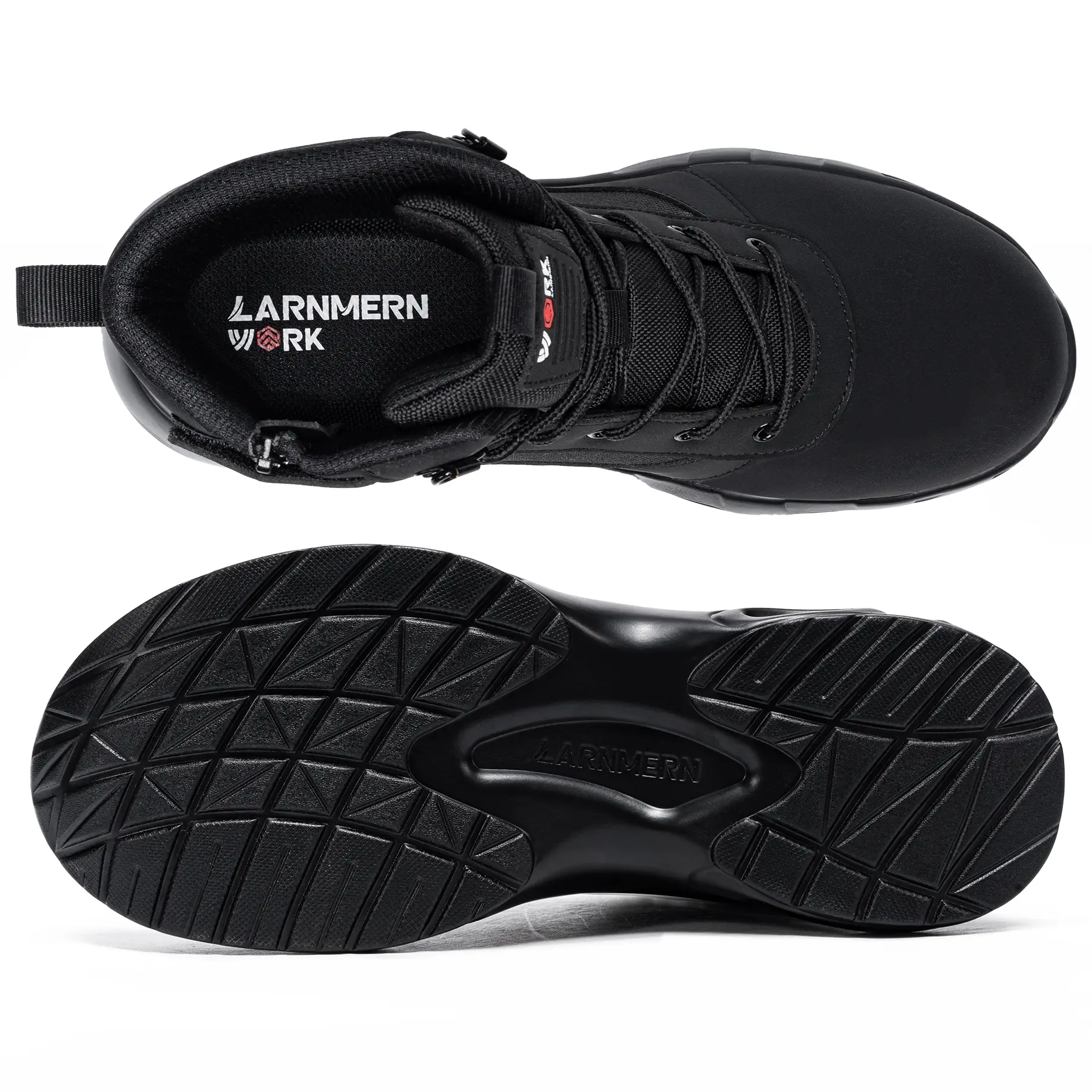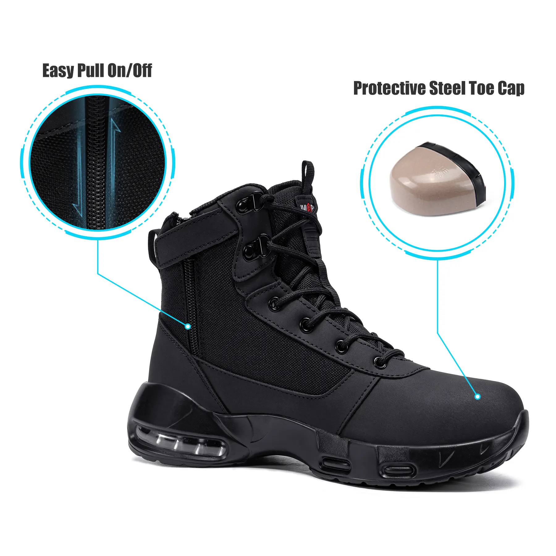 These work boots are equipped with a side zipper for easy on and off. Shoelaces provide a decorative touch and extra support for a secure fit.