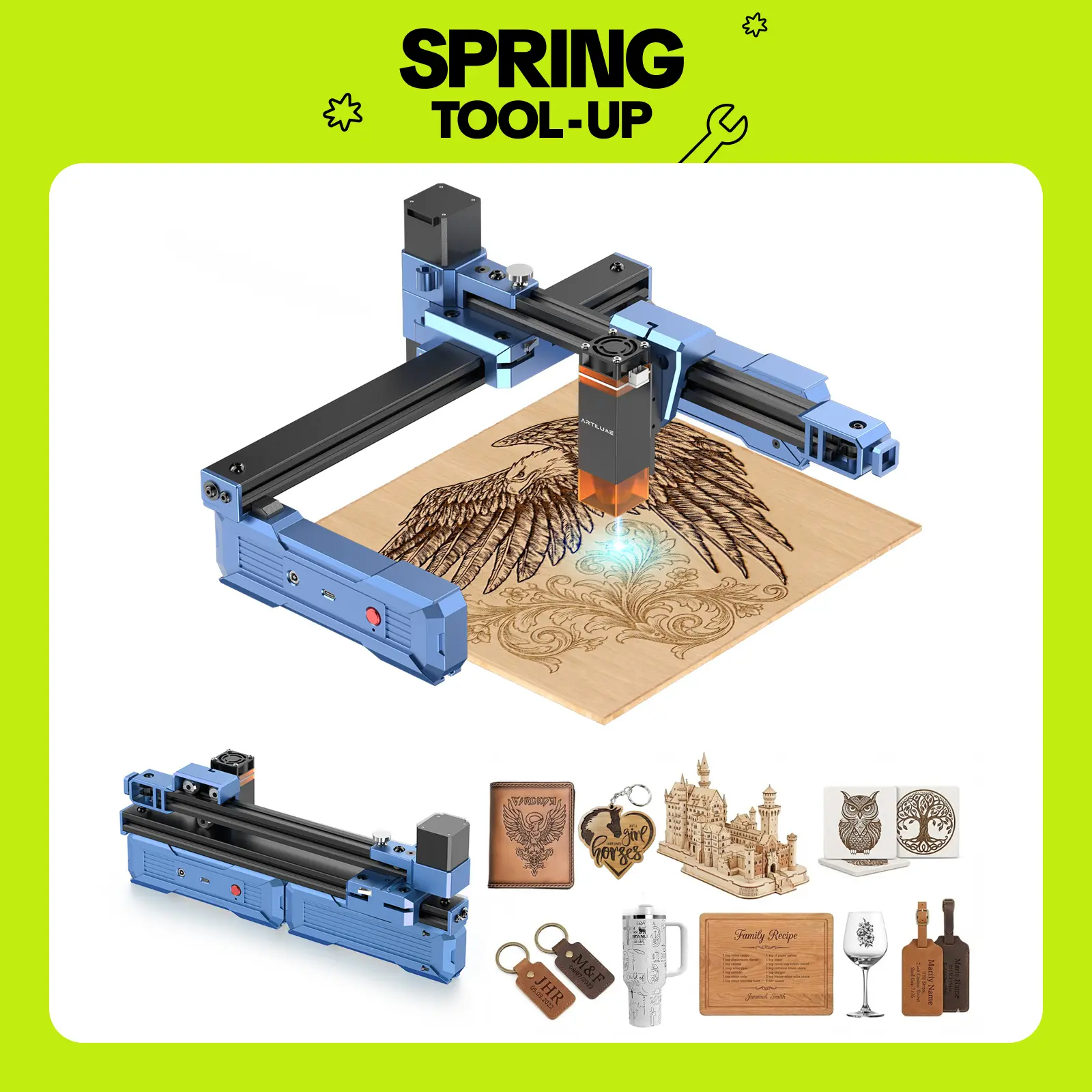 ARTILUME T1 Laser Engraver, Portable & Foldable Laser Engraver and Cutter Machine, 0.01mm Precision, Large Working Area 150×200mm for Wood, Leather, Acrylic, Ideal for Beginners & Small Businesses